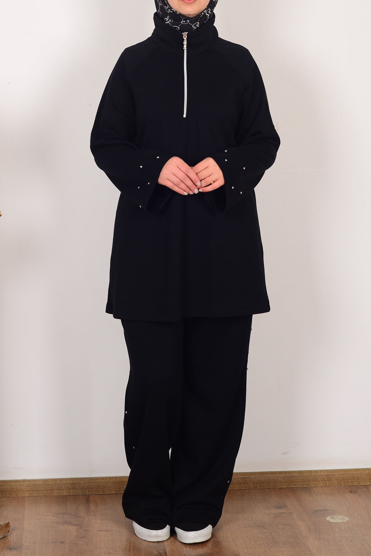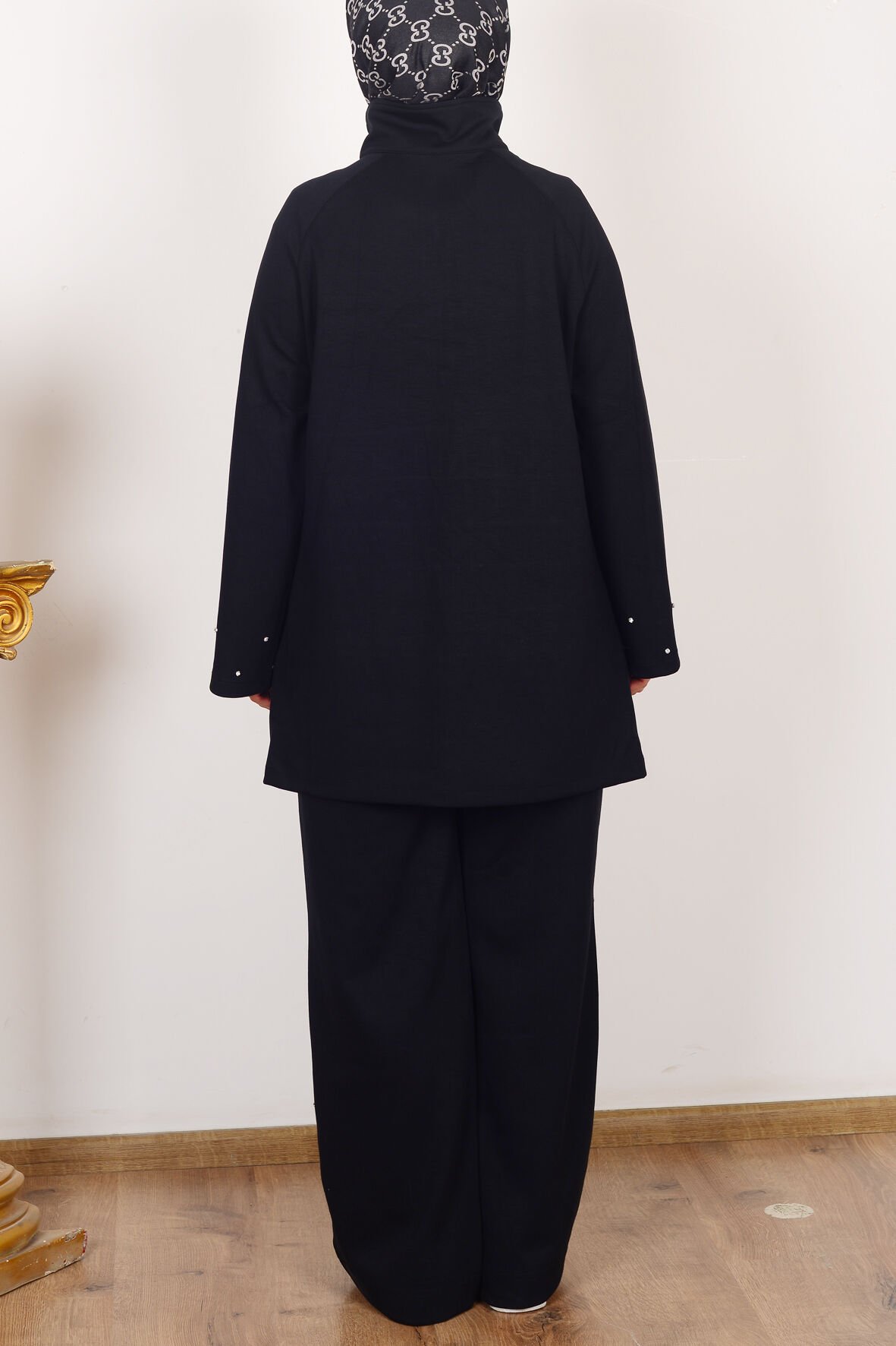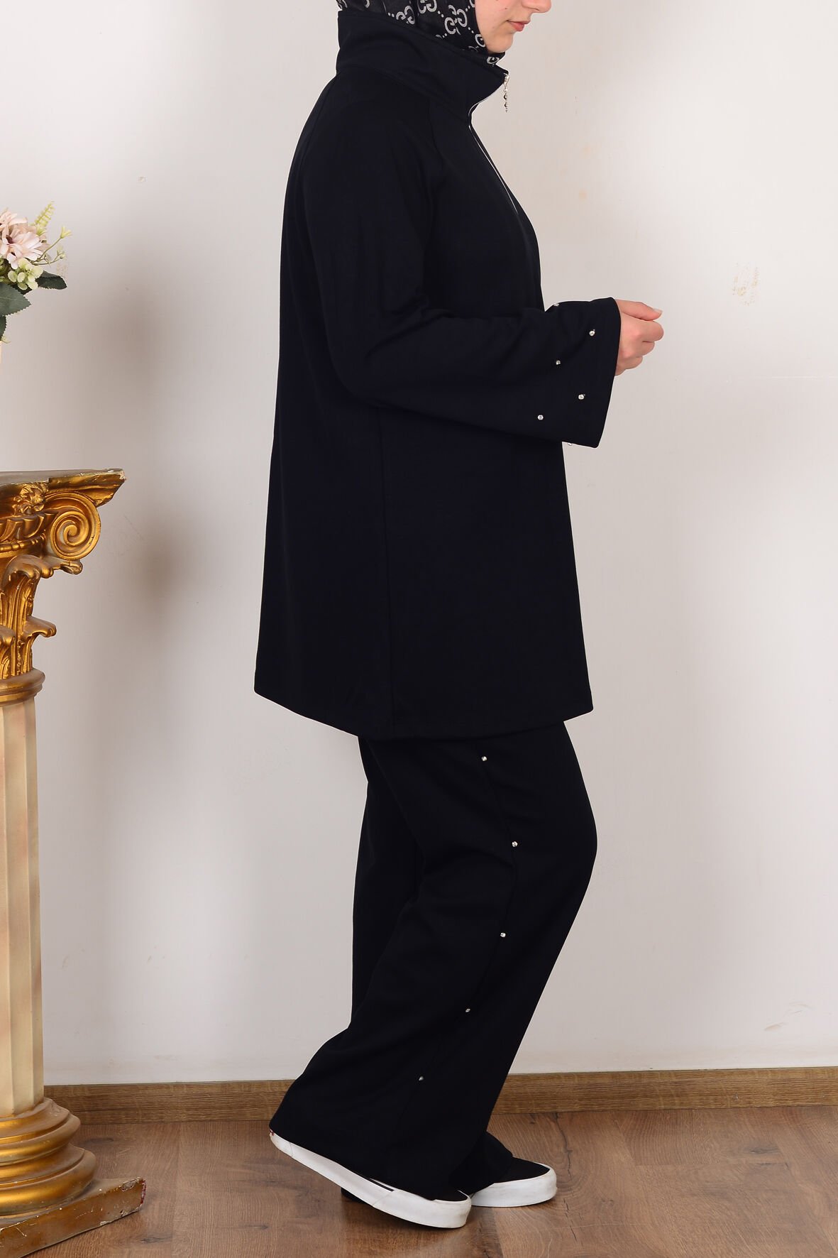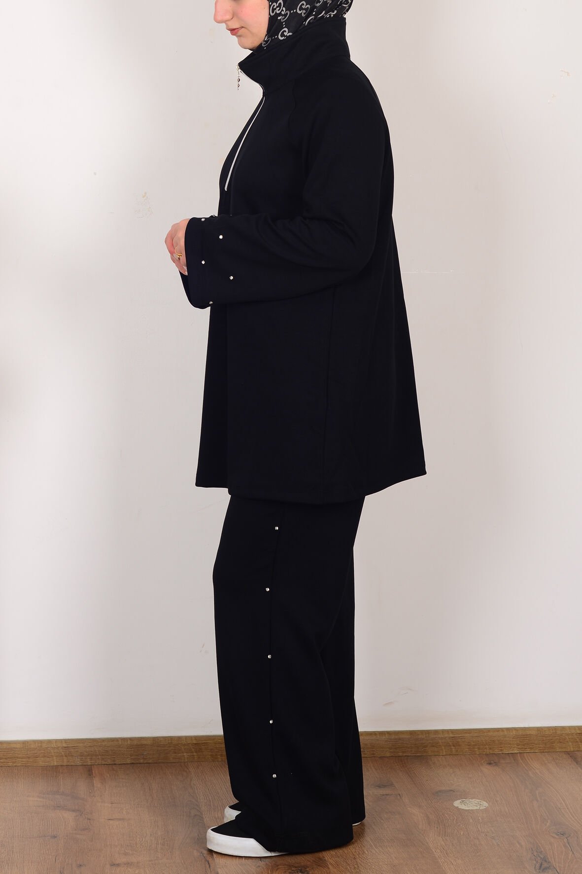 Allday B30106A0 Siyah Kadın Yumuşak Dokulu Taşlı Pantolonlu Takım