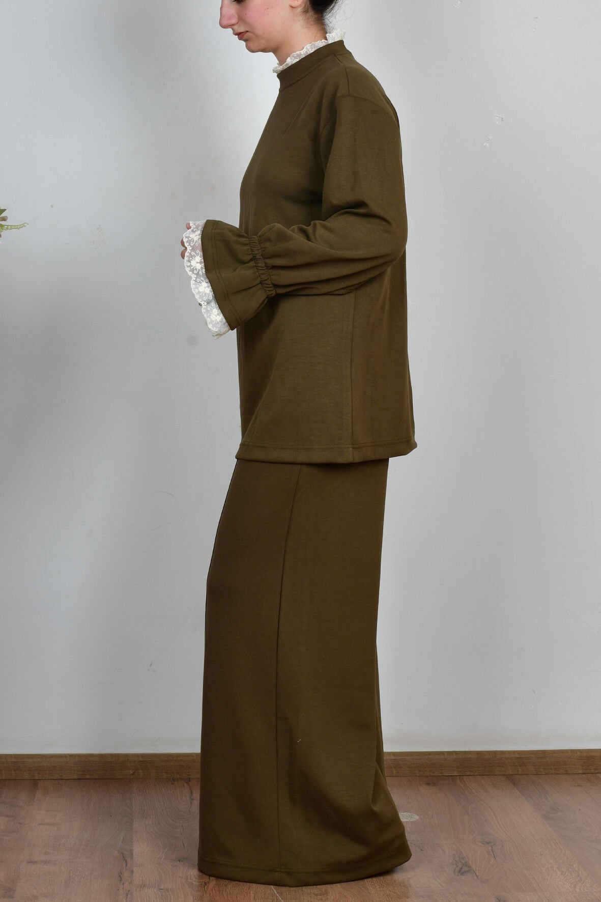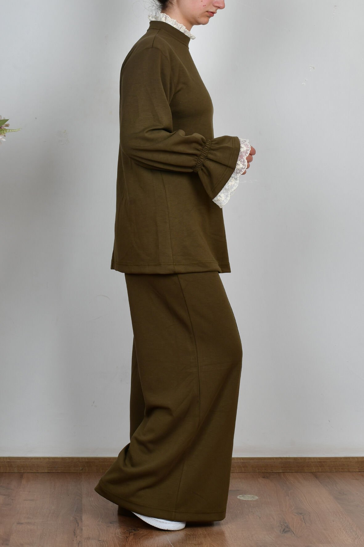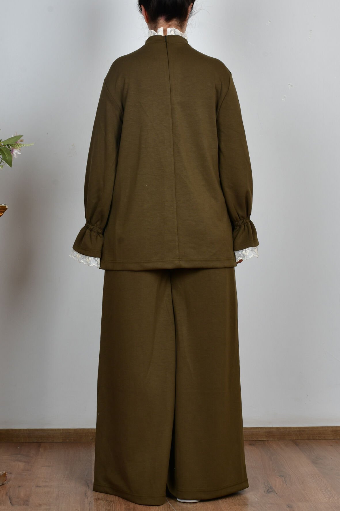 Allday B30107A0 Haki Kadın Yumuşak Dokulu Fisto Garnili Pantolonlu Takım
