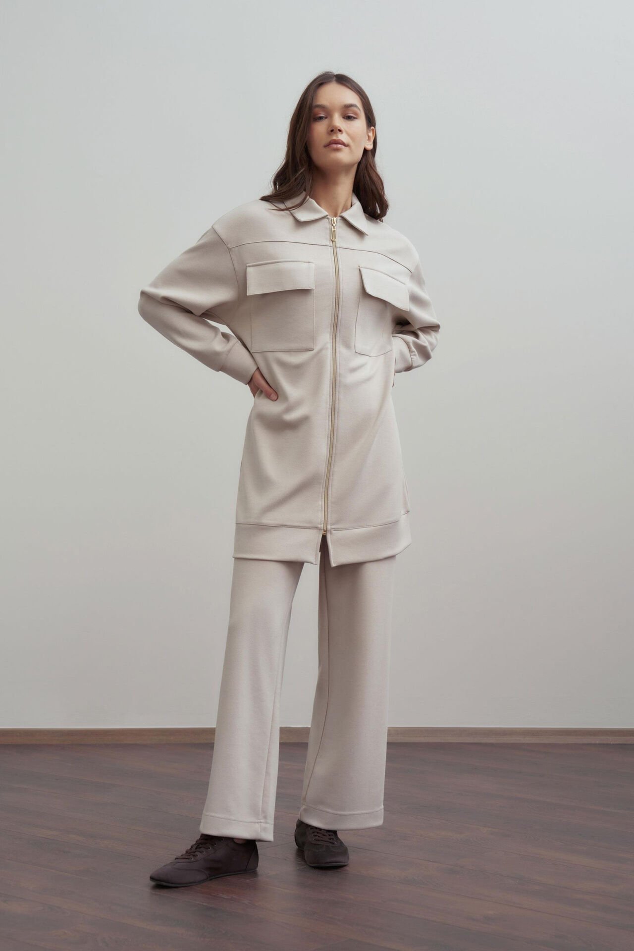 Şıklığı detaylarda arayanlara özel Taş-Yumuşak Dokulu Fermuarlı Pantolonlu Takım ile zarif bir görünüm yakalayın. Günlük ve özel kombinler için ideal tasarım ALLDAY’de!