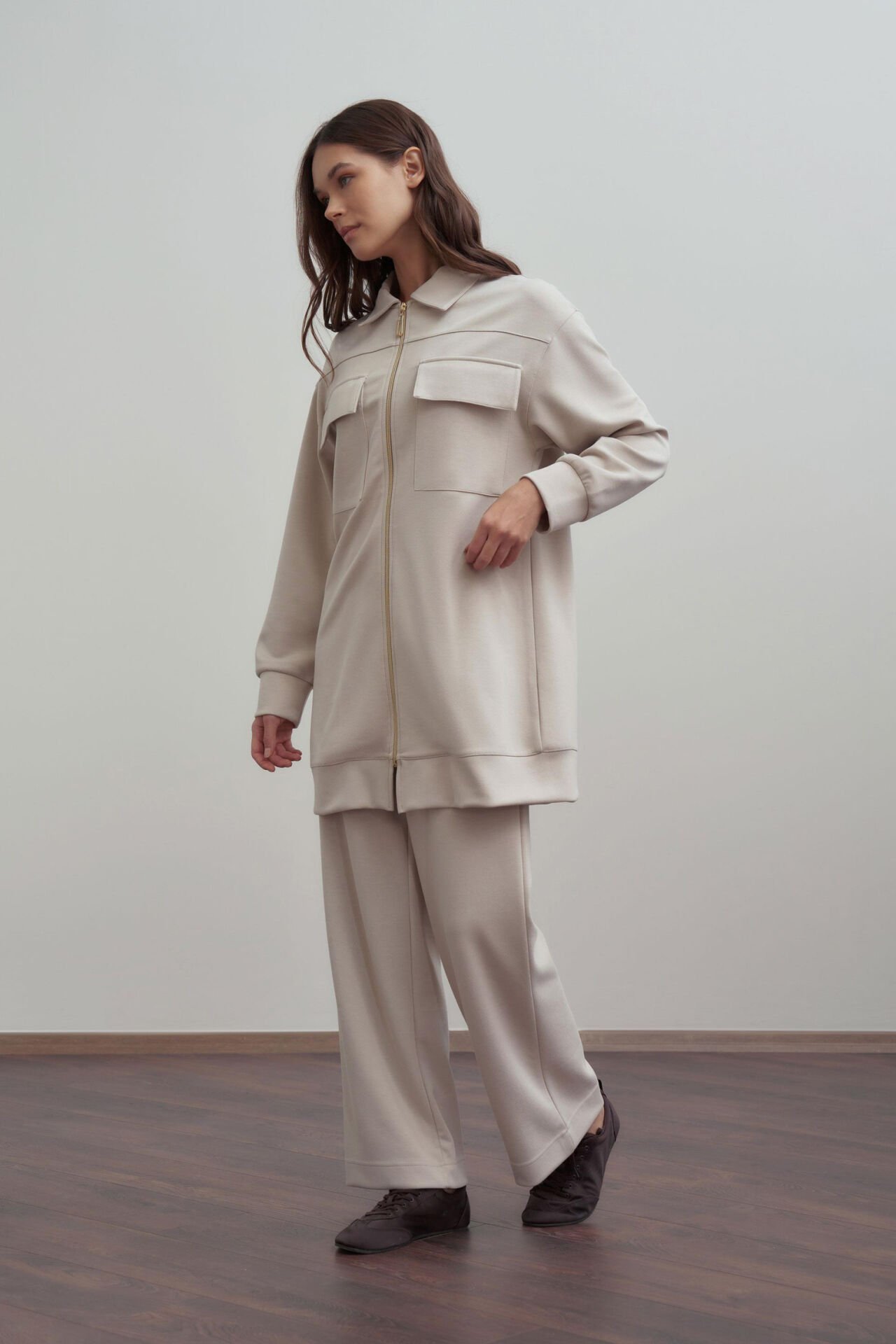 Allday B30110a0 Taş Kadın Yumuşak Dokulu Fermuarlı Pantolonlu Takım