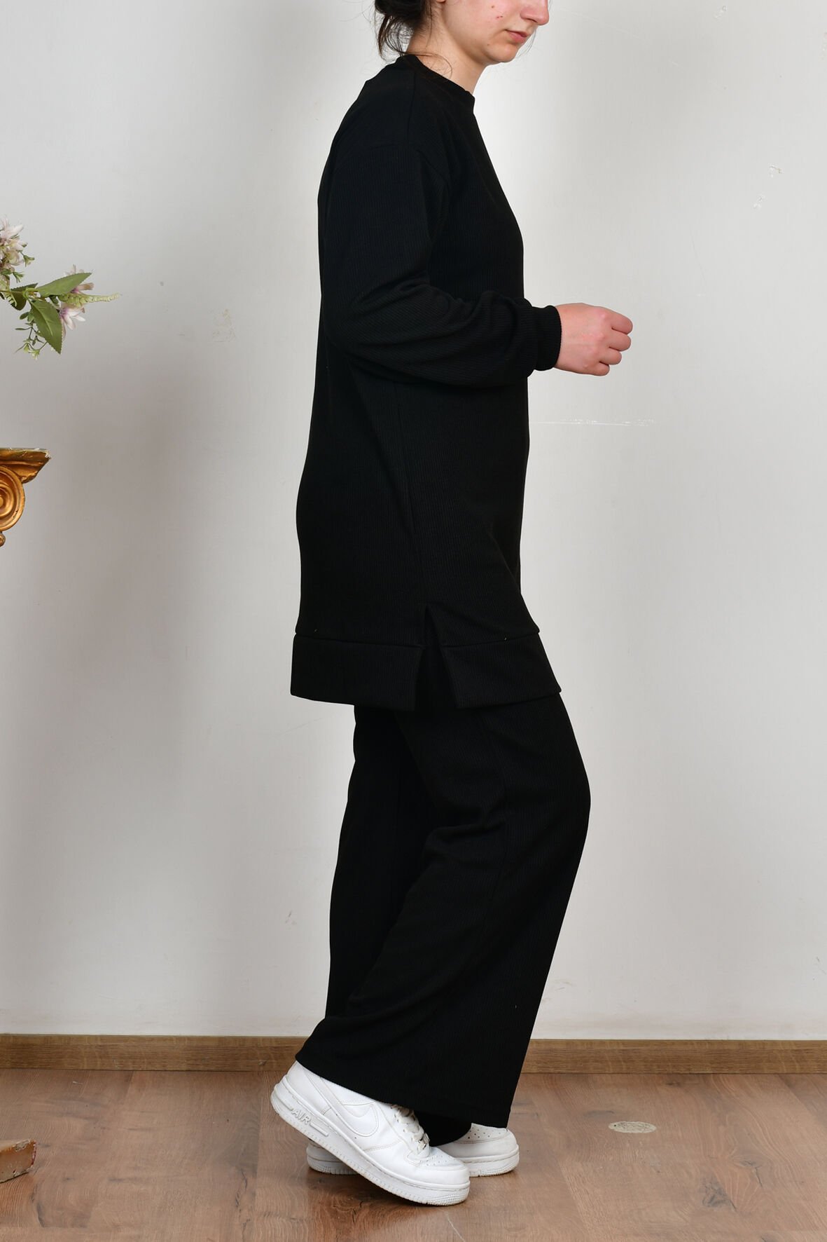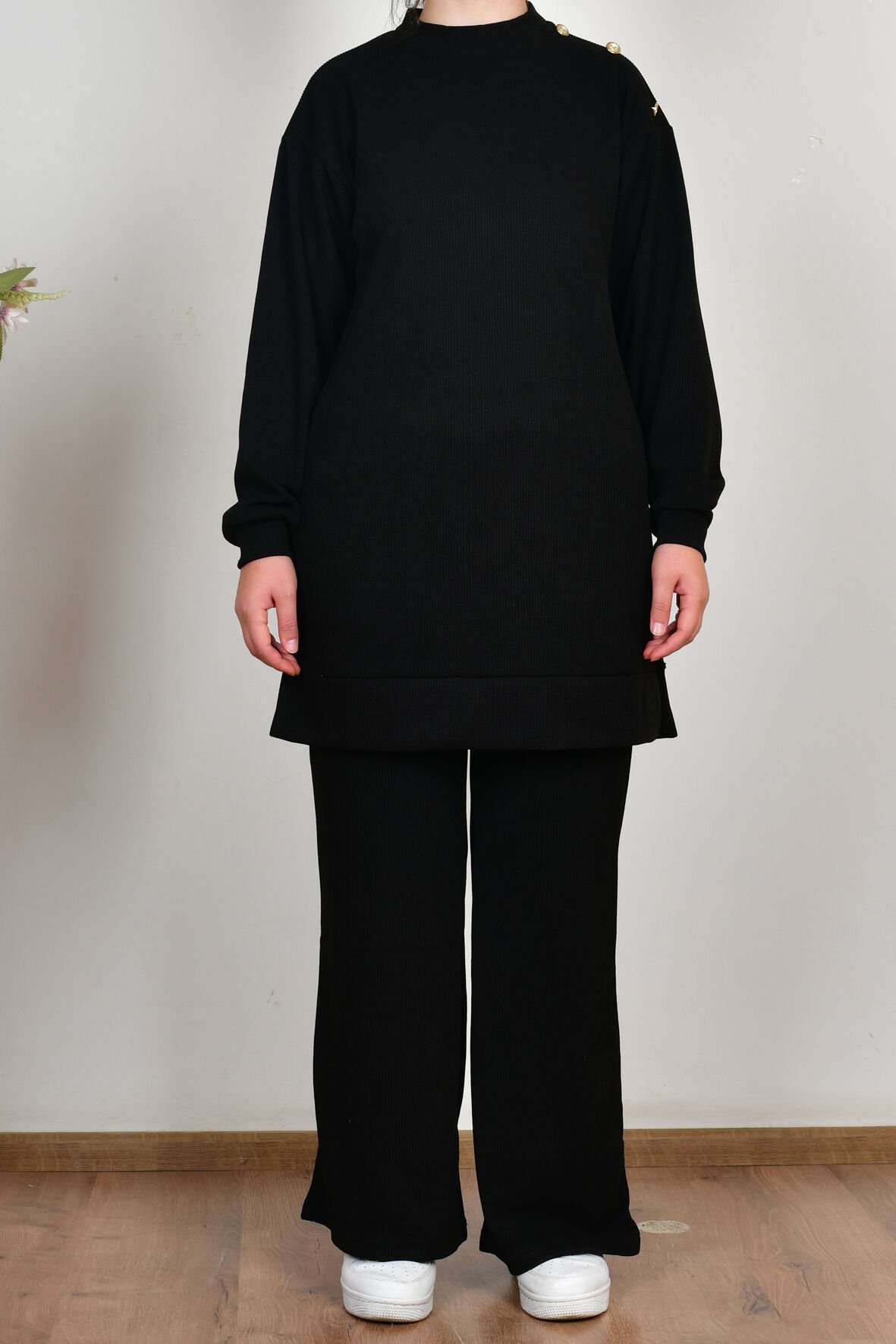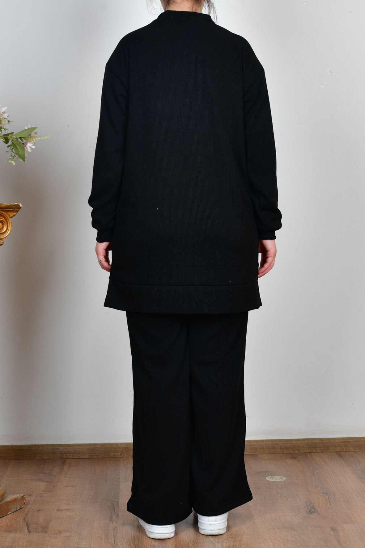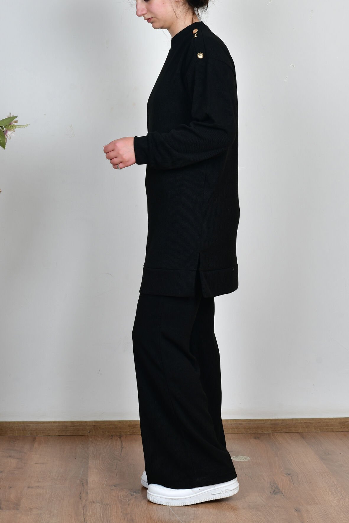 Allday B30111A0 Siyah Kadın Fitilli Dökümlü Pantolonlu Takım