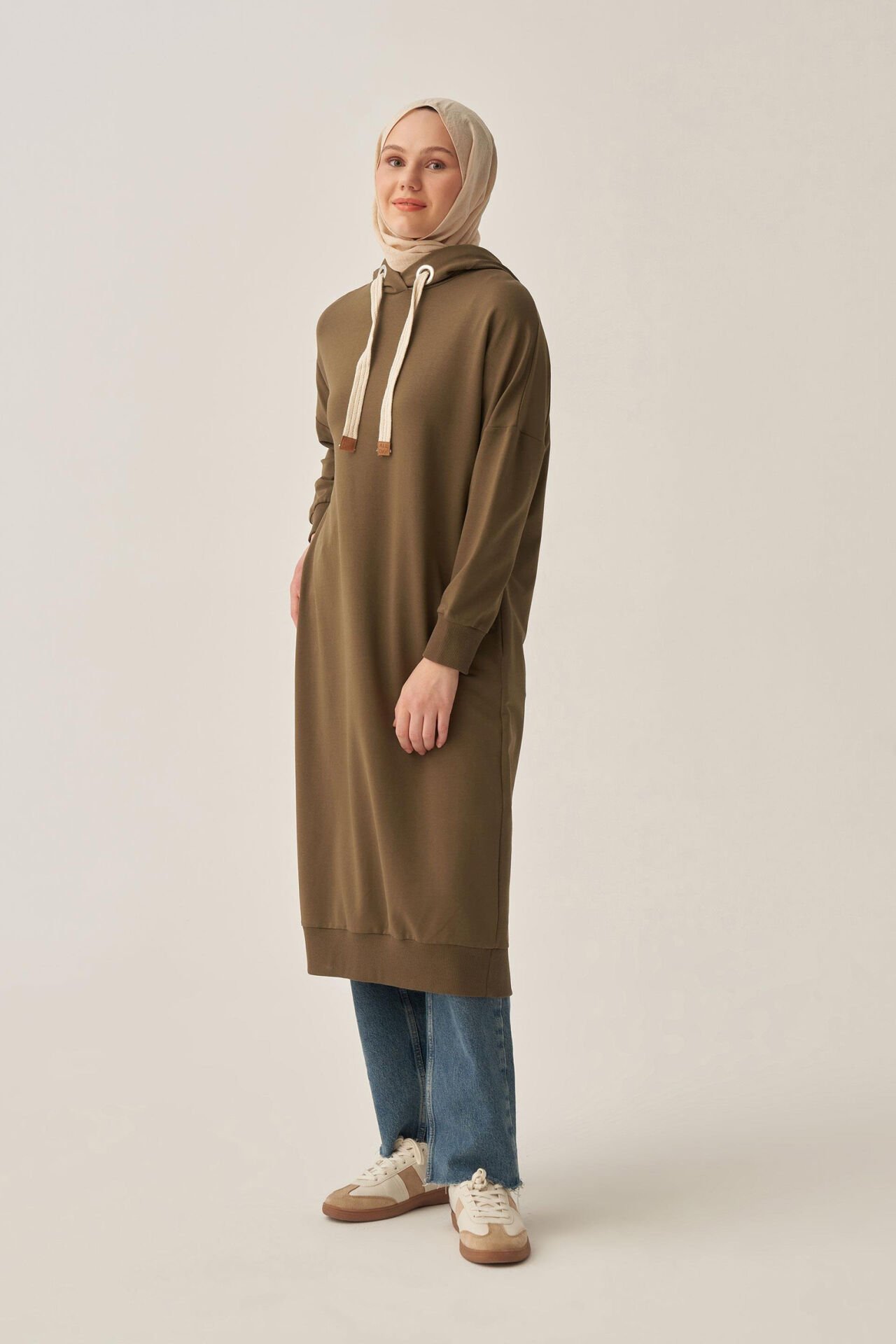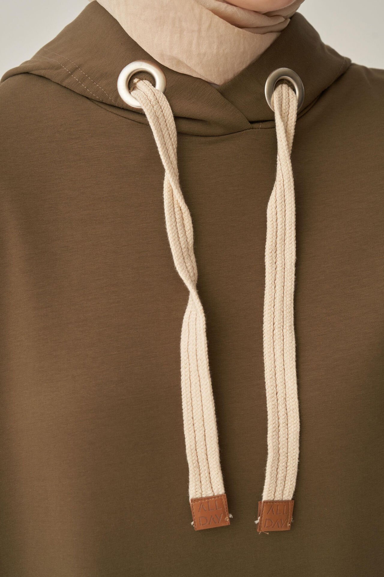 Allday B52018A0 Haki Kadın Kuşgözlü Kapüşonlu Cepli Likralı Uzun Sweat