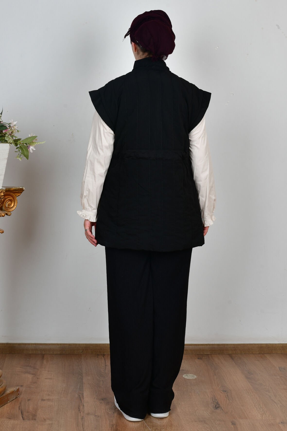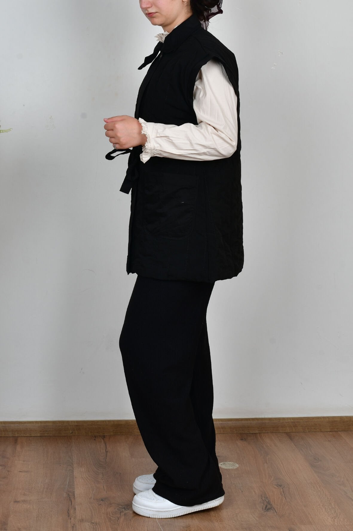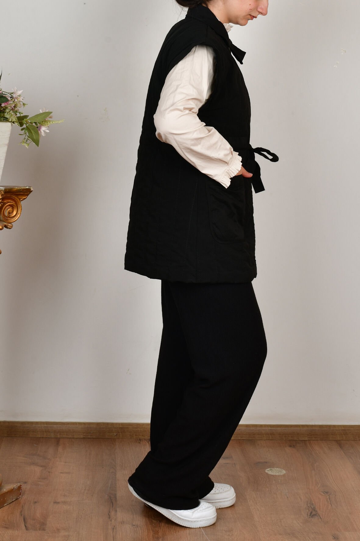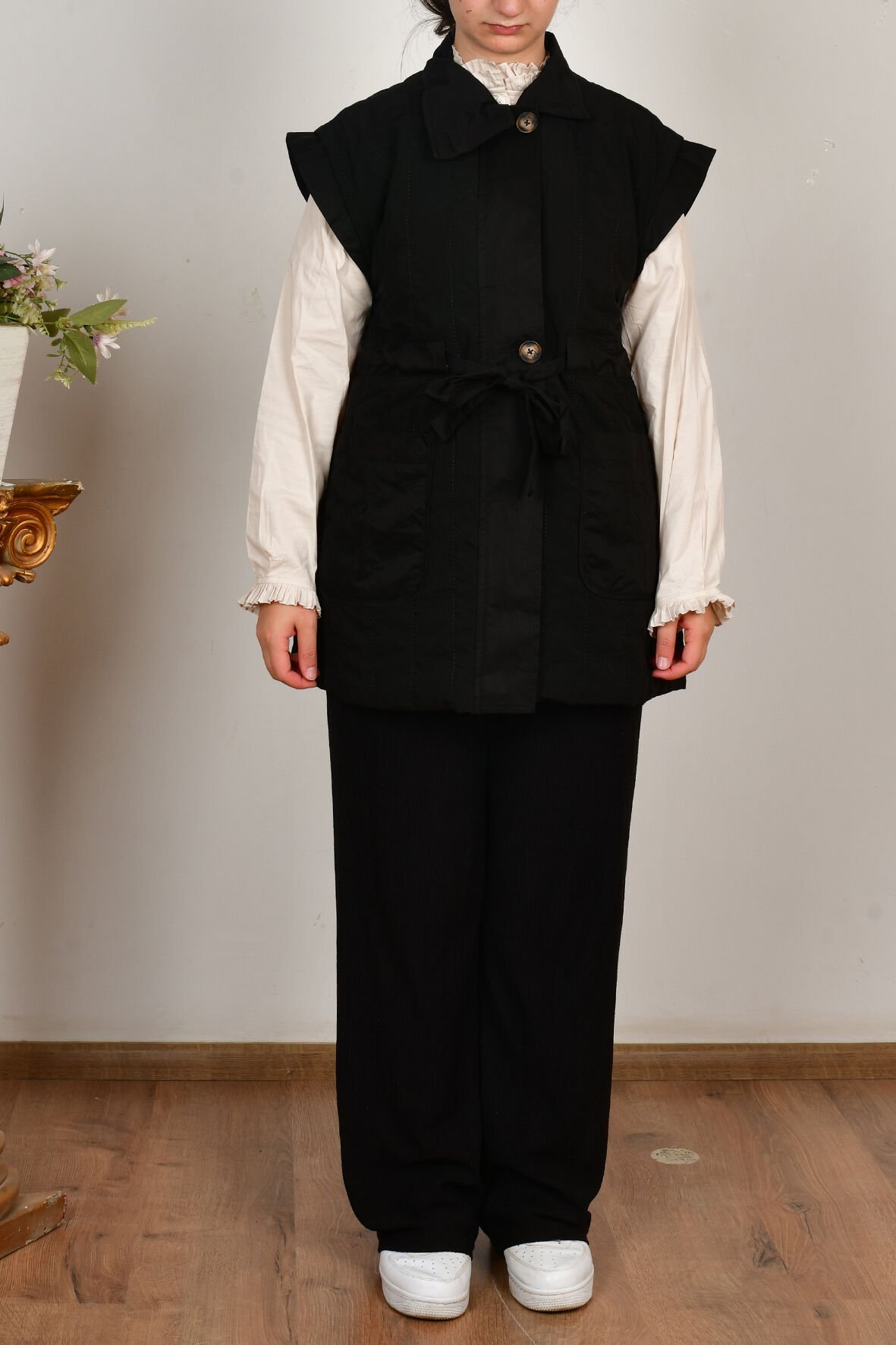 Allday W90044A0 Siyah Kadın Düğmeli Kemerli Kapitone Yelek