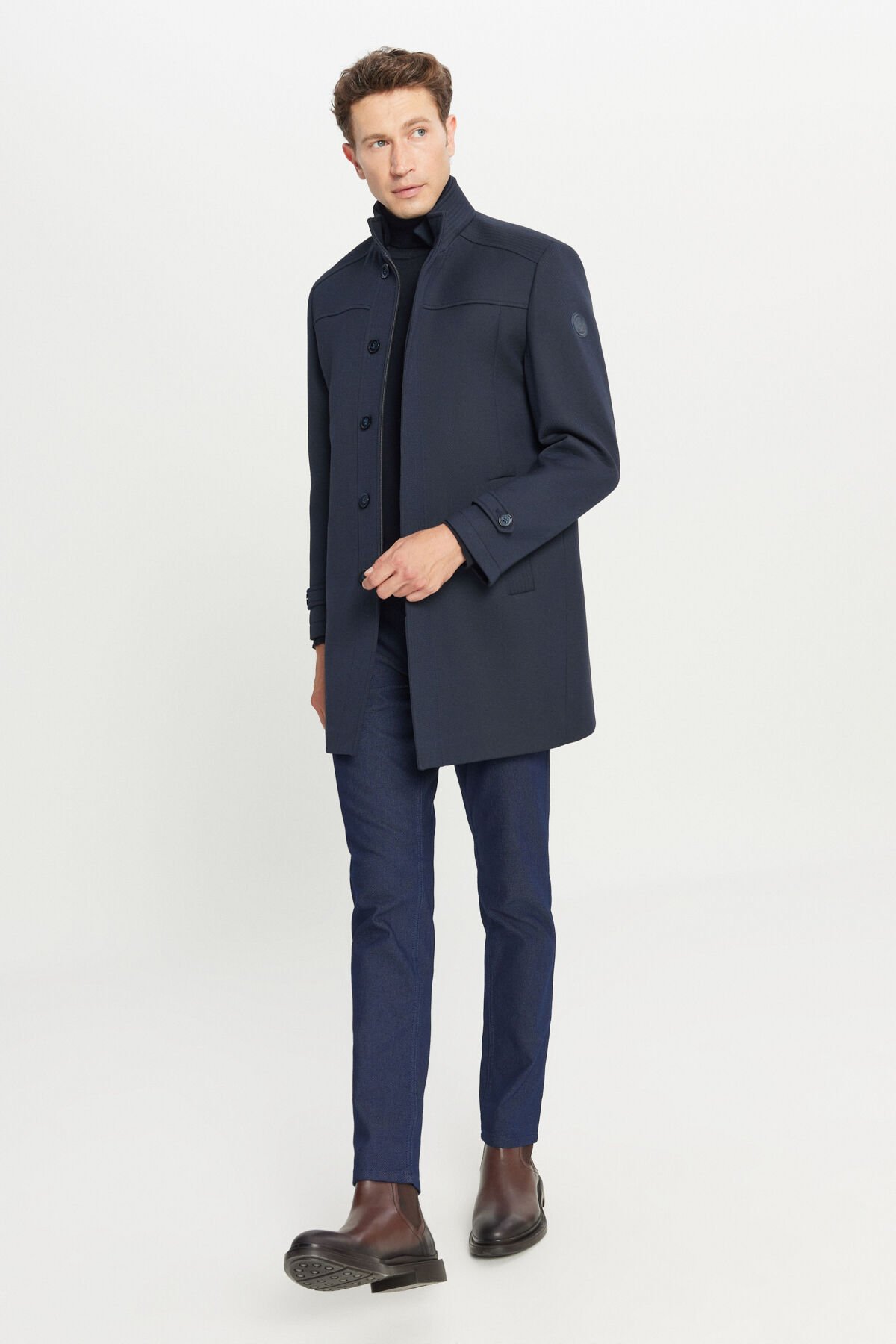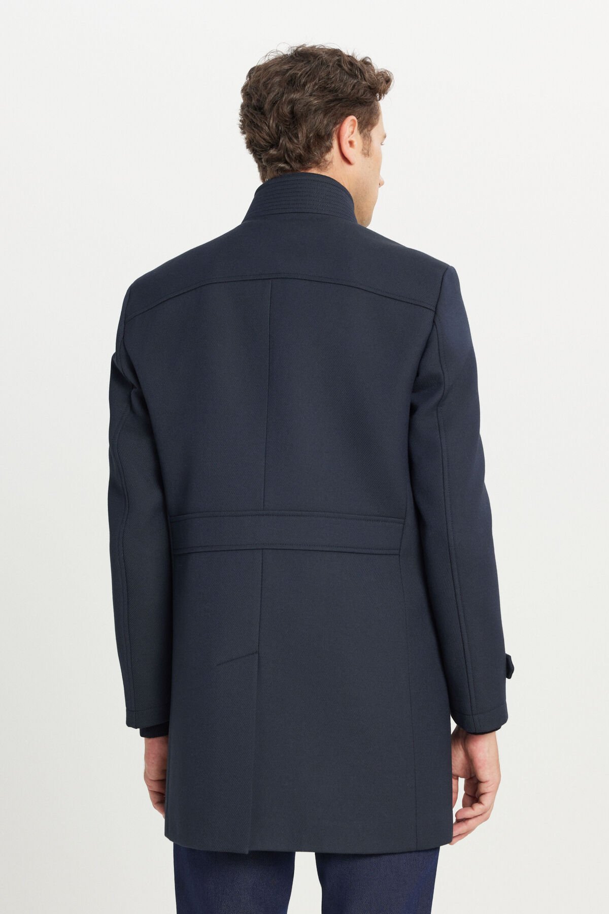 Altınyıldız ACE007261085 Lacivert Erkek Yünlü Standart Fit Normal Kesim Dik Yaka Diagonal Desenli Yan Cepli Kaban