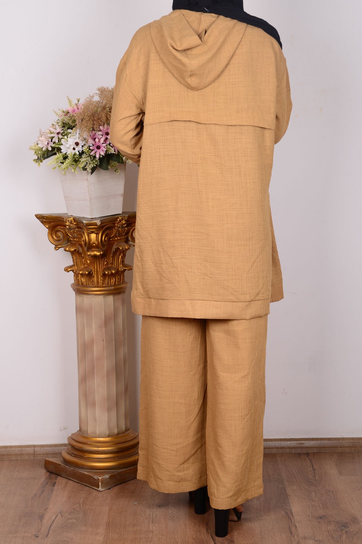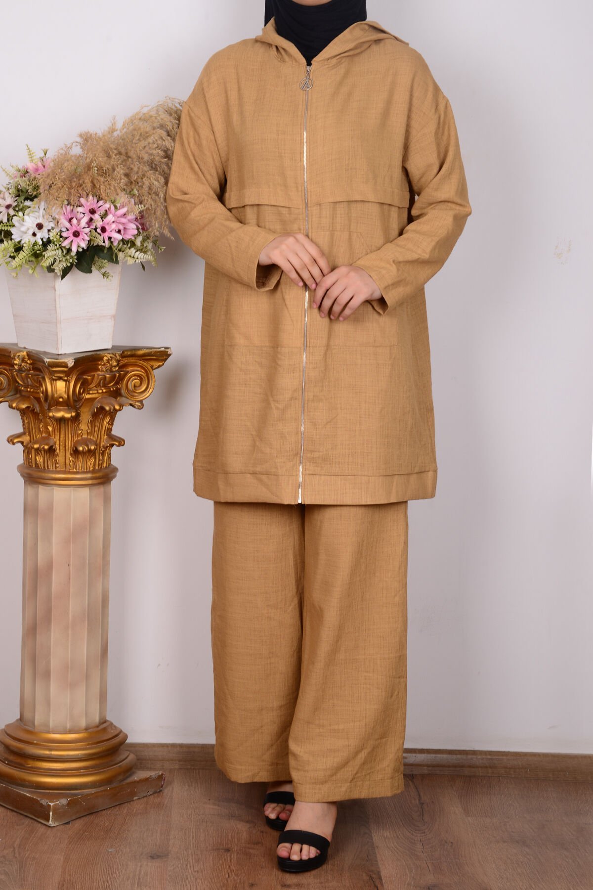 Armine 24YT638 Karamel Kadın Kapişonlu Önden Fermuarlı Üst Geniş Paça Pantalonlu Takım