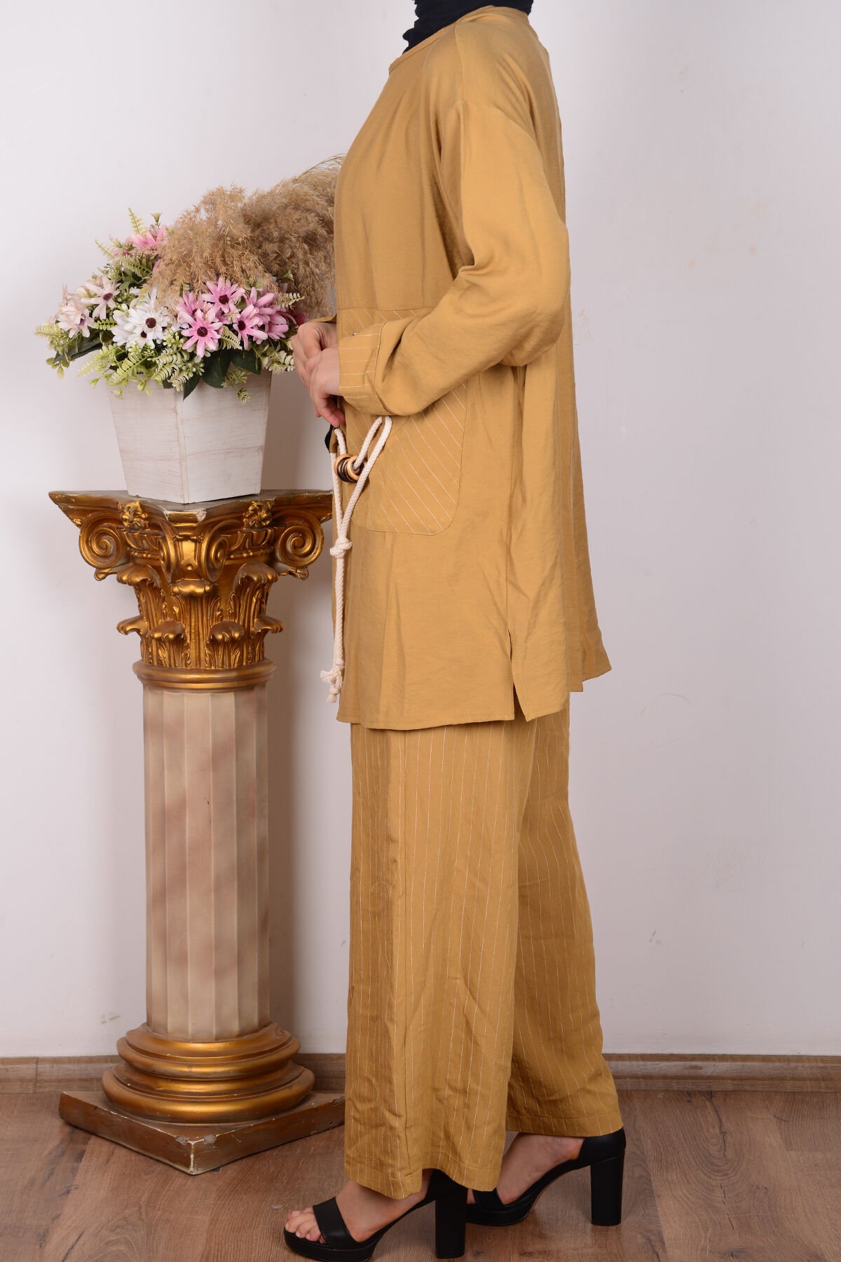 Armine 24YT670 Hardal Kadın Askı İp Detaylı Arkadan Fermuarlı Bisiklet Yaka Pantalonu Beli Lastikli Geniş Paça Çift Cepli Trend Takım
