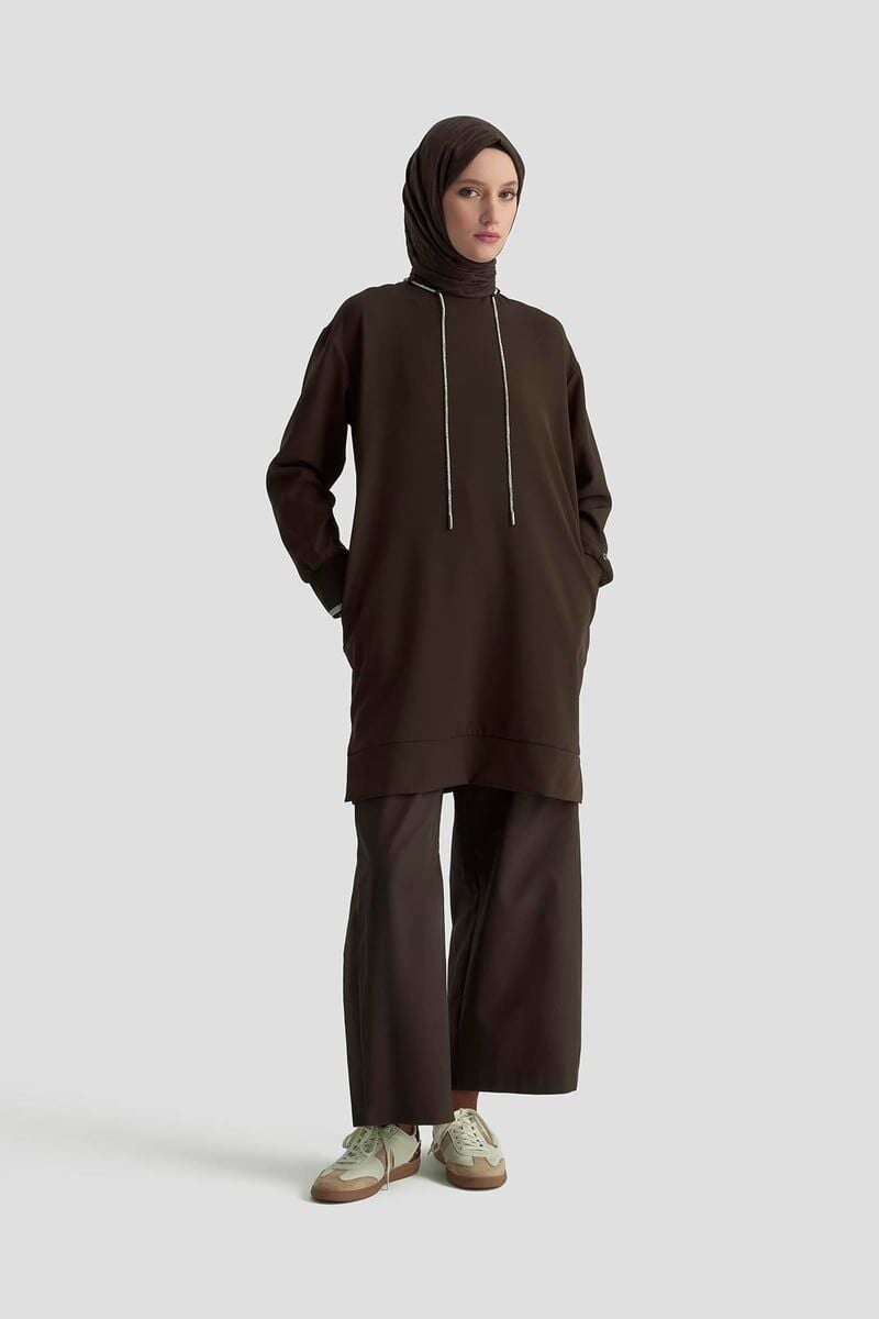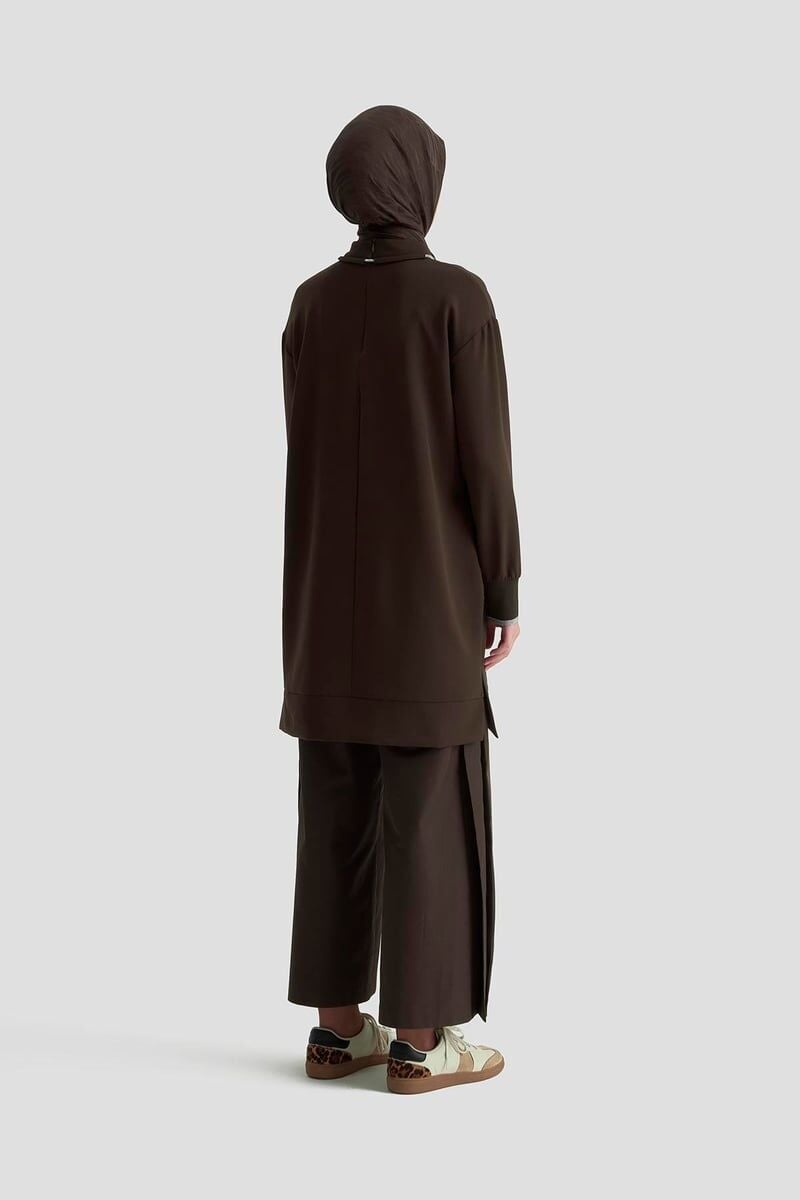 Armine 25KT436 Kahverengi Kadın Yakası Taş Bağcık Detaylı Kolları Ribanalı Tunik