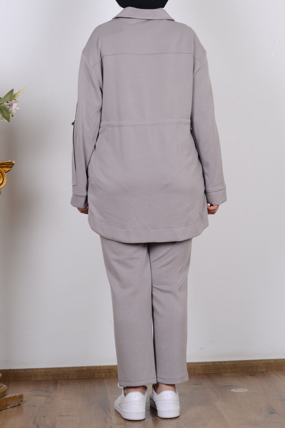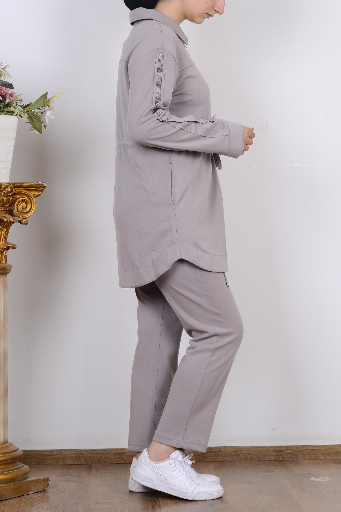 Armine 25KT604 Gri takım, zarif taş işlemeleri ve belden bağlama detayıyla öne çıkıyor. Uzun ve rahat kesim üst, feminen bir görünüm sağlarken dar paça pantolon günlük kullanım için konfor sunuyor. İki iplik kumaşıyla yumuşak ve esnek yapıya sahip.