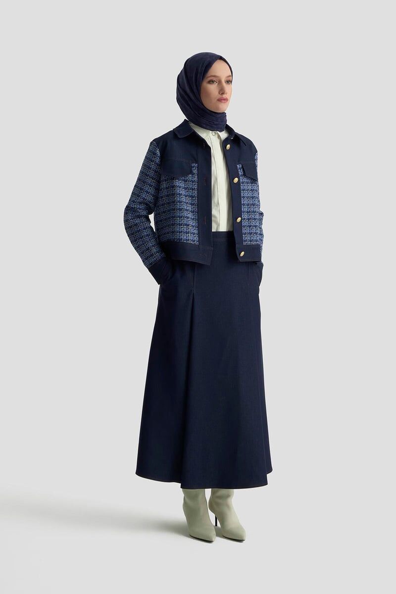 Armine Trend Etekli Takım armn 25KT605 Ürün Bilgisi : Sonbahar Ve Kış için uygundur, tercihen İlkabaharda giyilebilir. Tam kalıptır. Kumaş Bilgisi: Ceket TİVÜT Kumaş, Etek KREP VEYA KOT Kumaş SEÇENEKLERİ Ürün Uzunluğu : Etek:95 cm - Ceket:55 cm Renk: SİYAH - İNDİGO