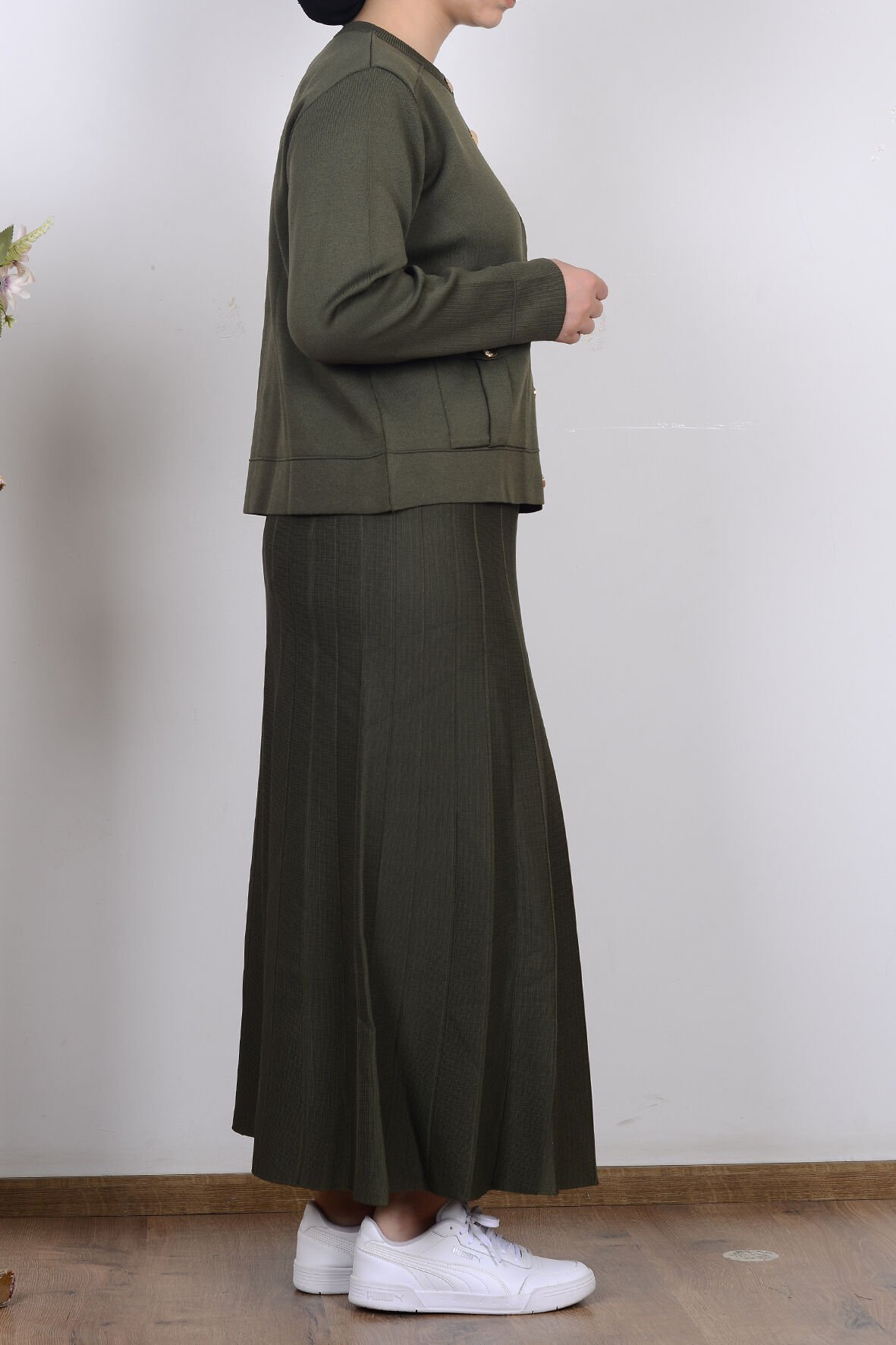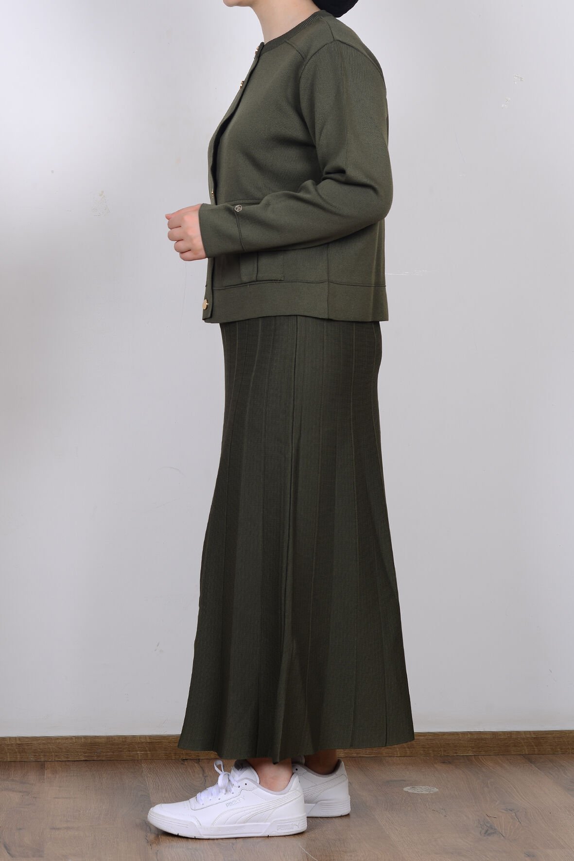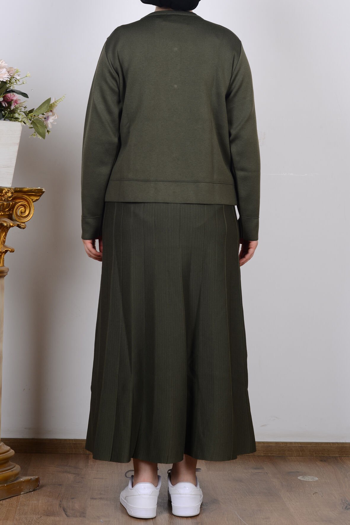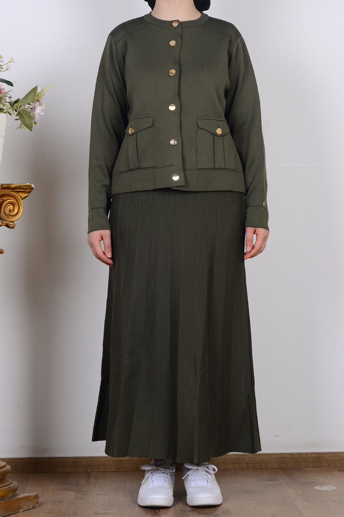Armine 25YTD6120 Haki Kadın Triko Takım, üst kısmında şık cep detayları ve etekli alt kısmıyla modern ve zarif bir görünüm sunar. Yumuşak triko dokusu, gün boyu konforlu kullanım sağlar. Haki rengi sayesinde her kombine uyum sağlayan, hem günlük hem özel kullanım için ideal bir takımdır.