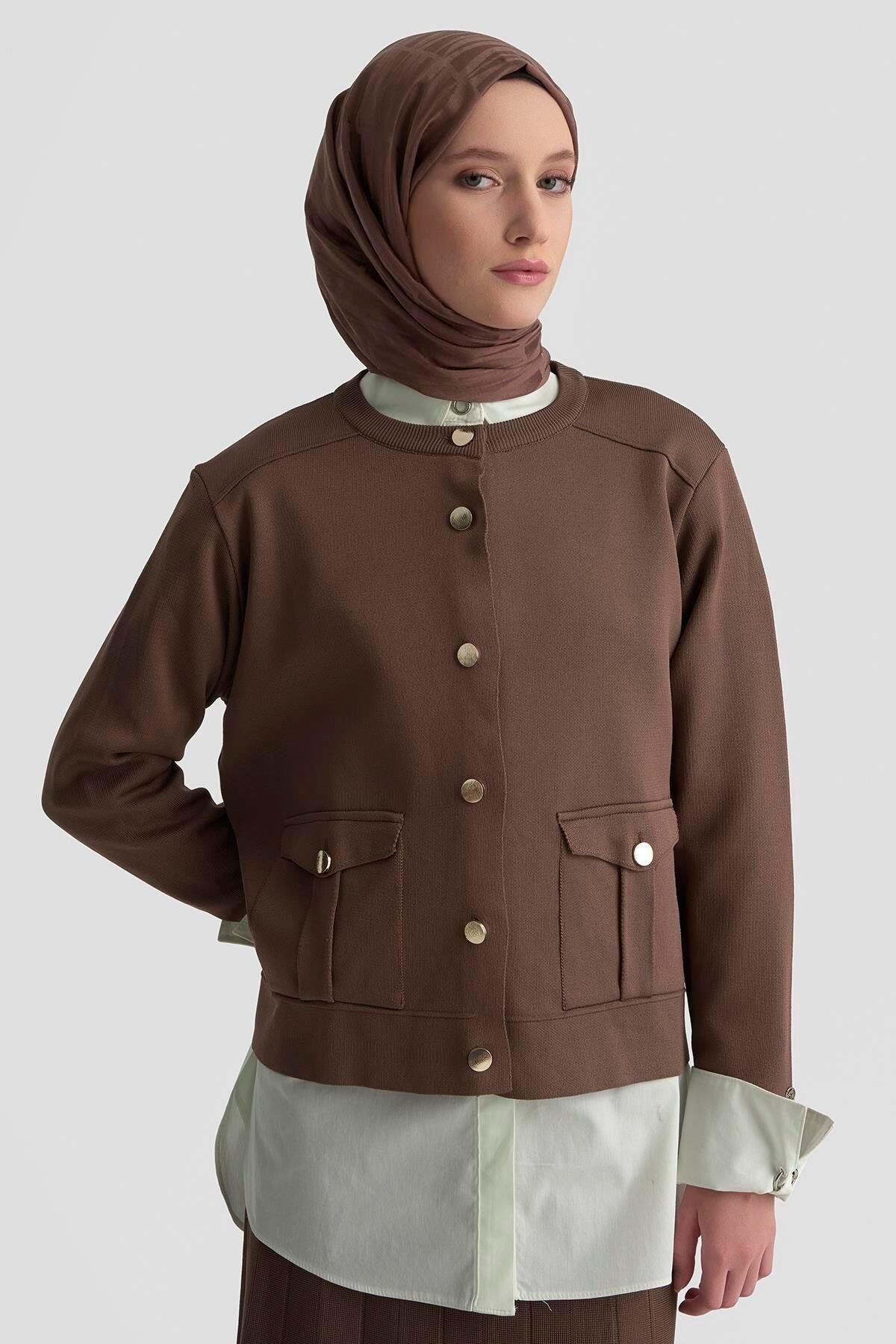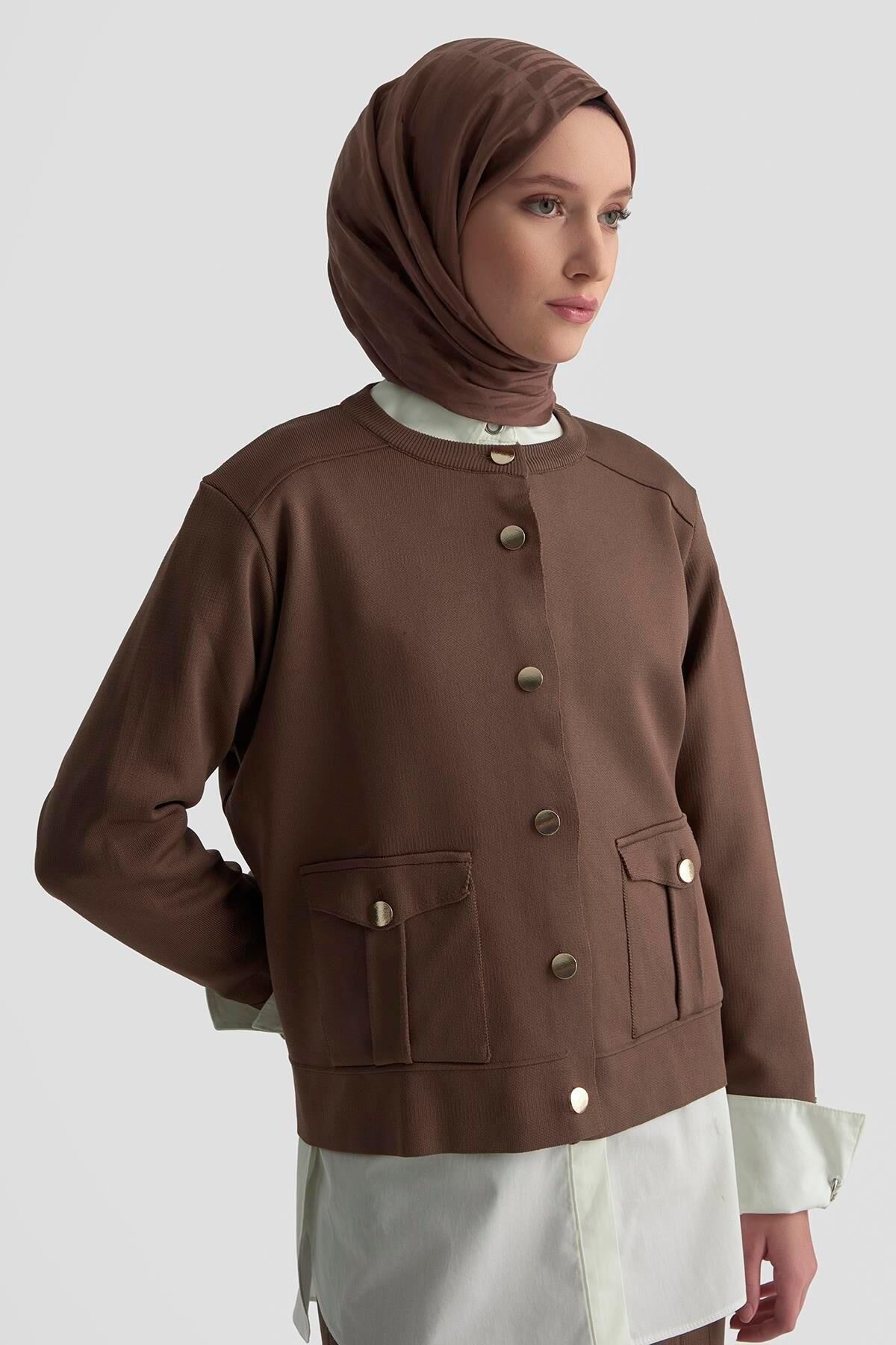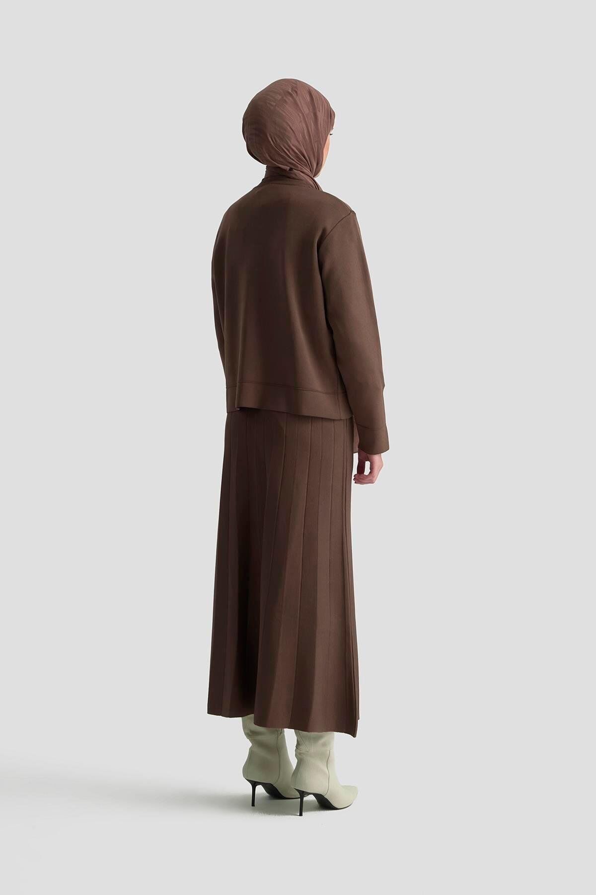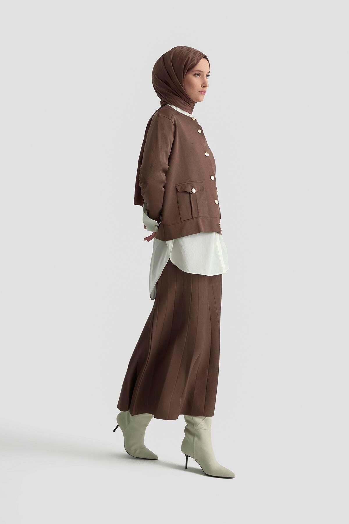 Armine 25YTD6120 Kahverengi Kadın Triko Takım, üst kısmında şık cep detayları ve etekli alt kısmıyla modern ve zarif bir görünüm sunar. Yumuşak triko dokusu, gün boyu konforlu kullanım sağlar. Kahverengi rengi sayesinde her kombine uyum sağlayan, hem günlük hem özel kullanım için ideal bir takımdır.