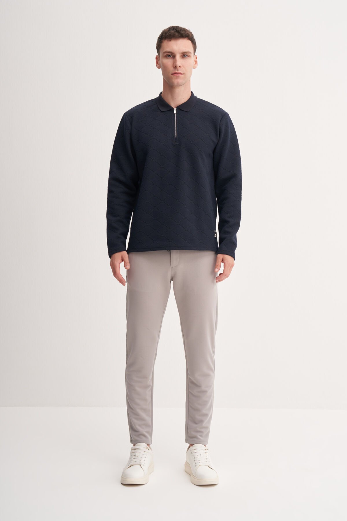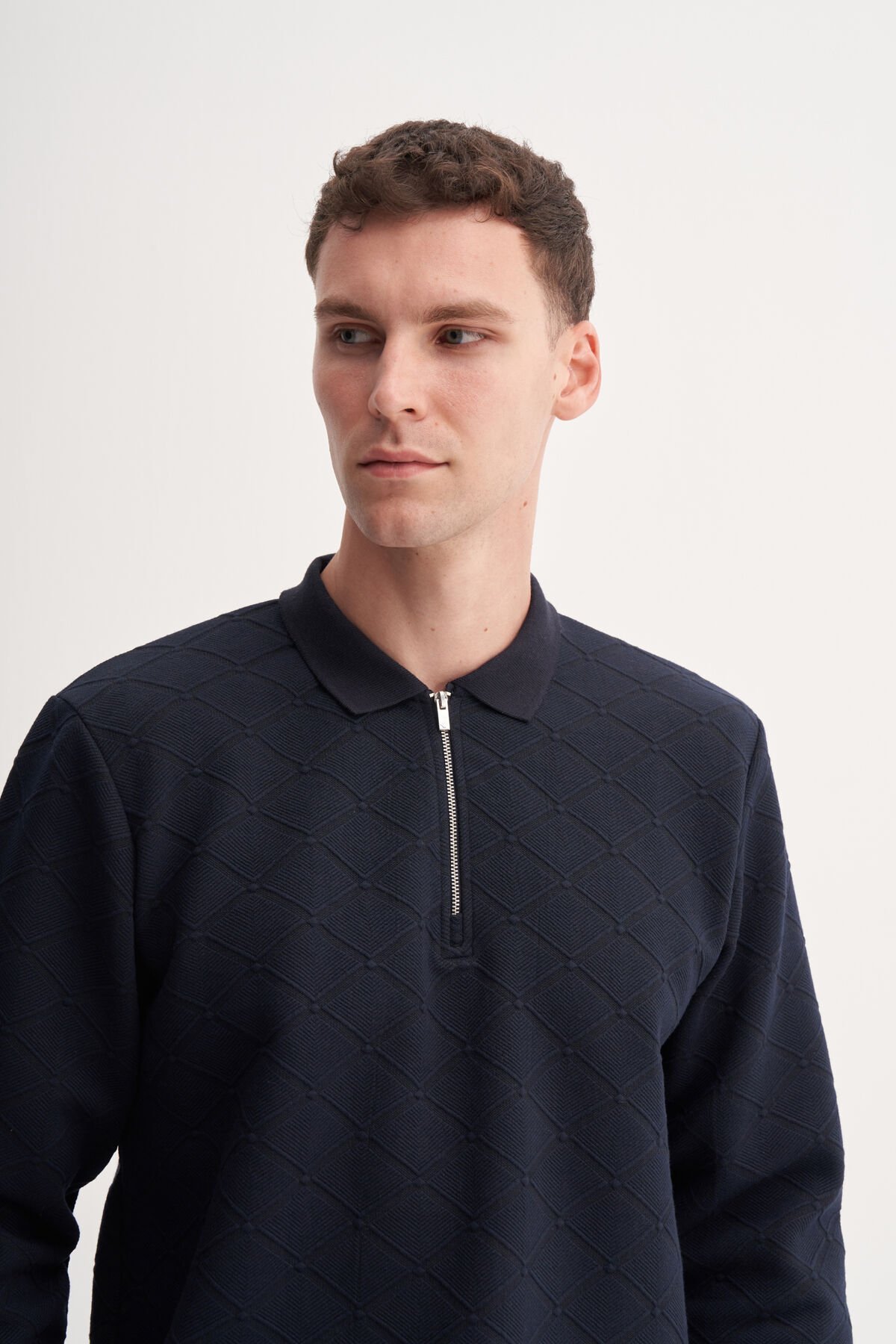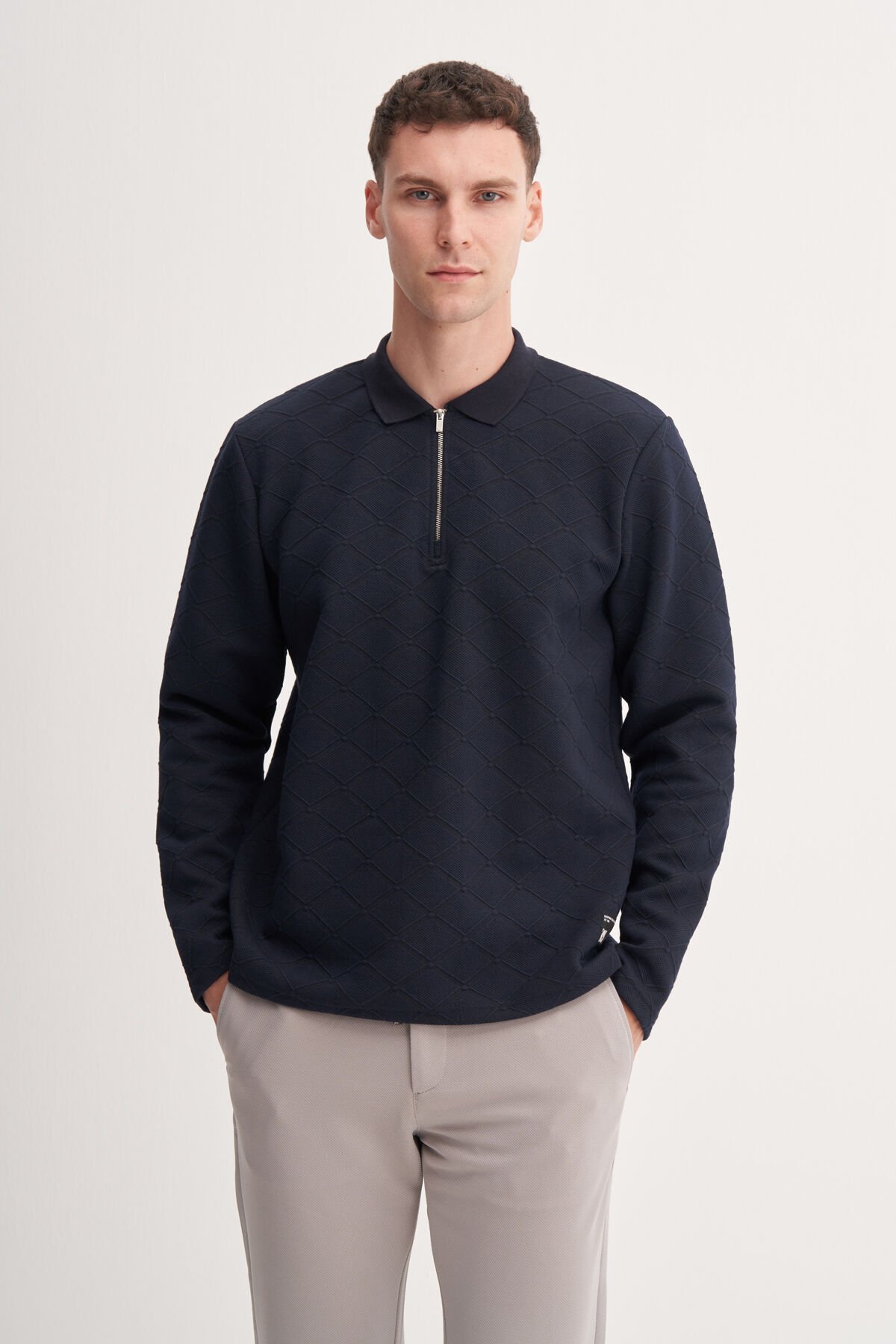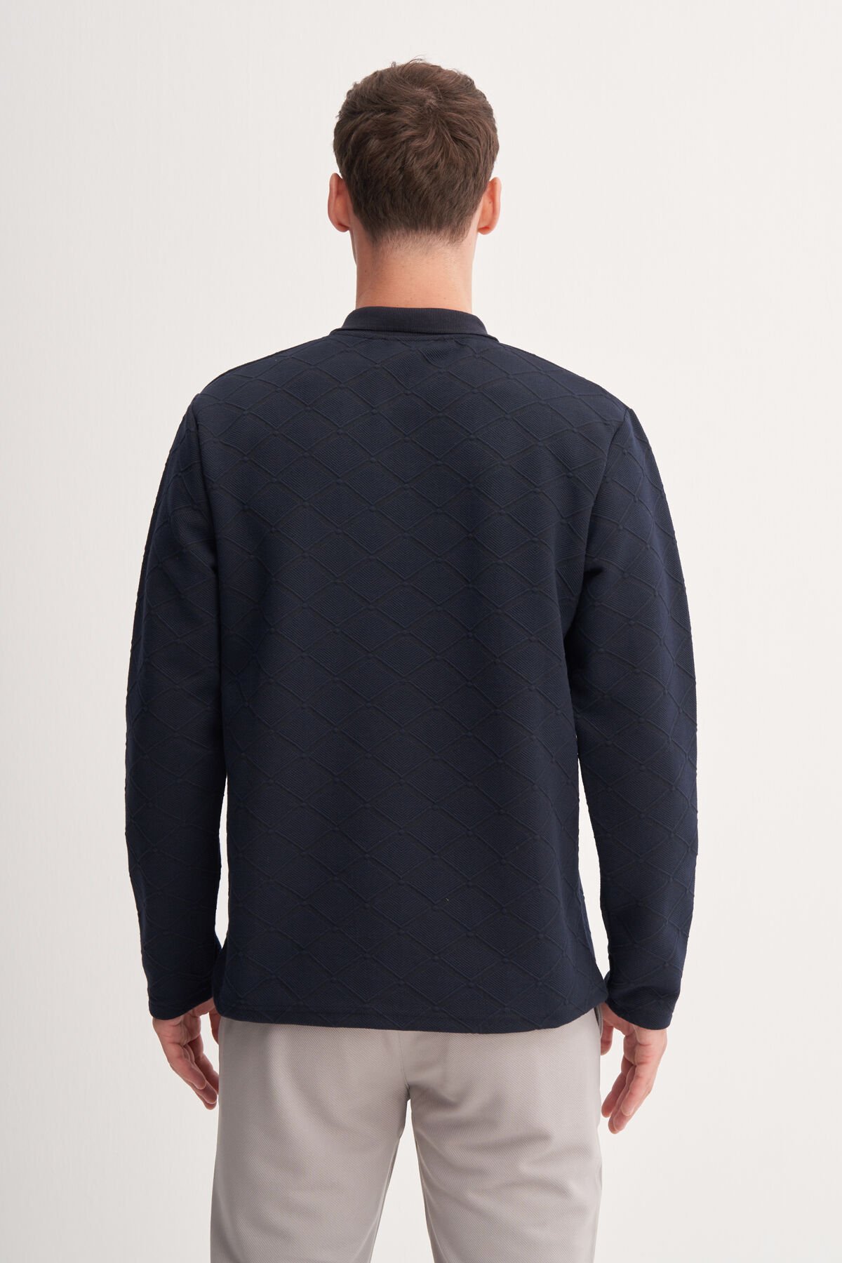 Cazador 53420 Lacivert Erkek Polo Yaka Yarım Fermuarlı Kendinden Desenli Sweatshirt