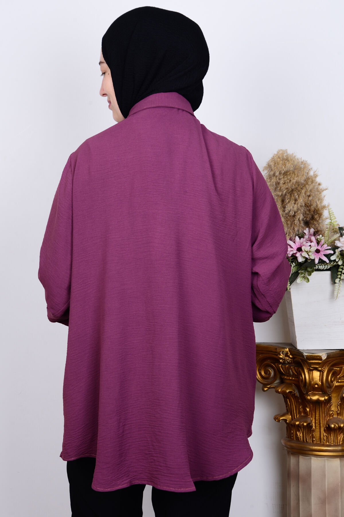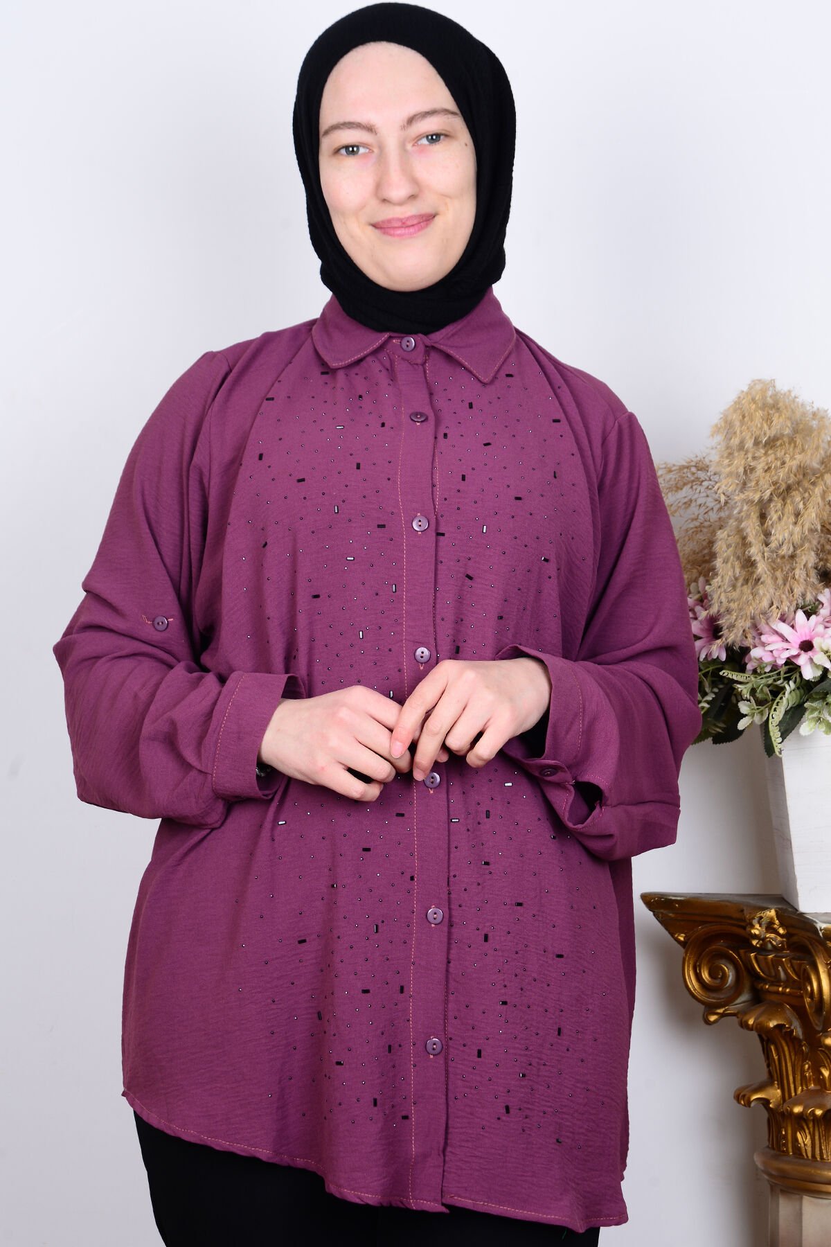 Ferace 8707 Mor Kadın Rahat Kesim Taşlı Önü Düğmeli Kolları Katlamalı Gömlek