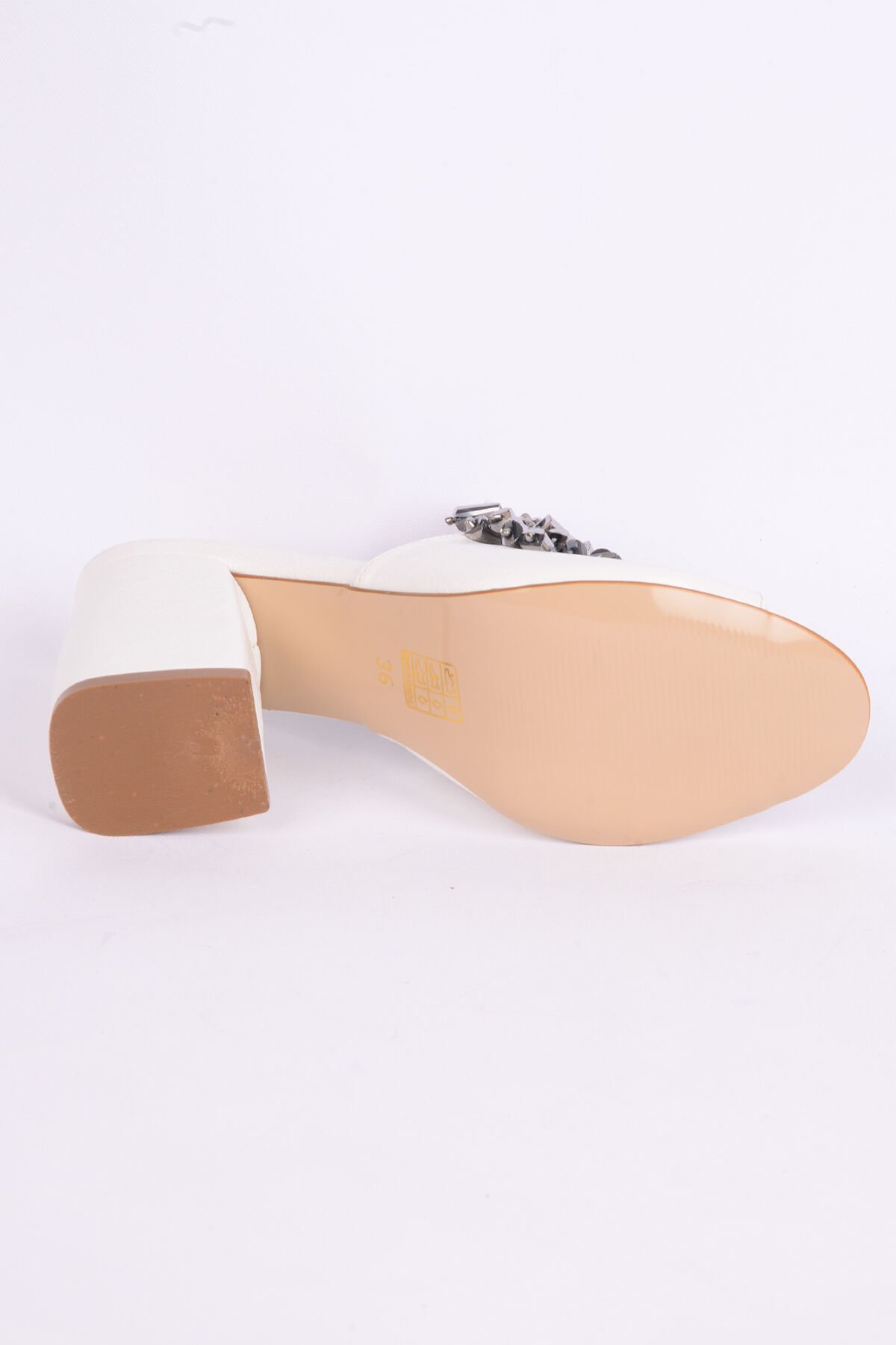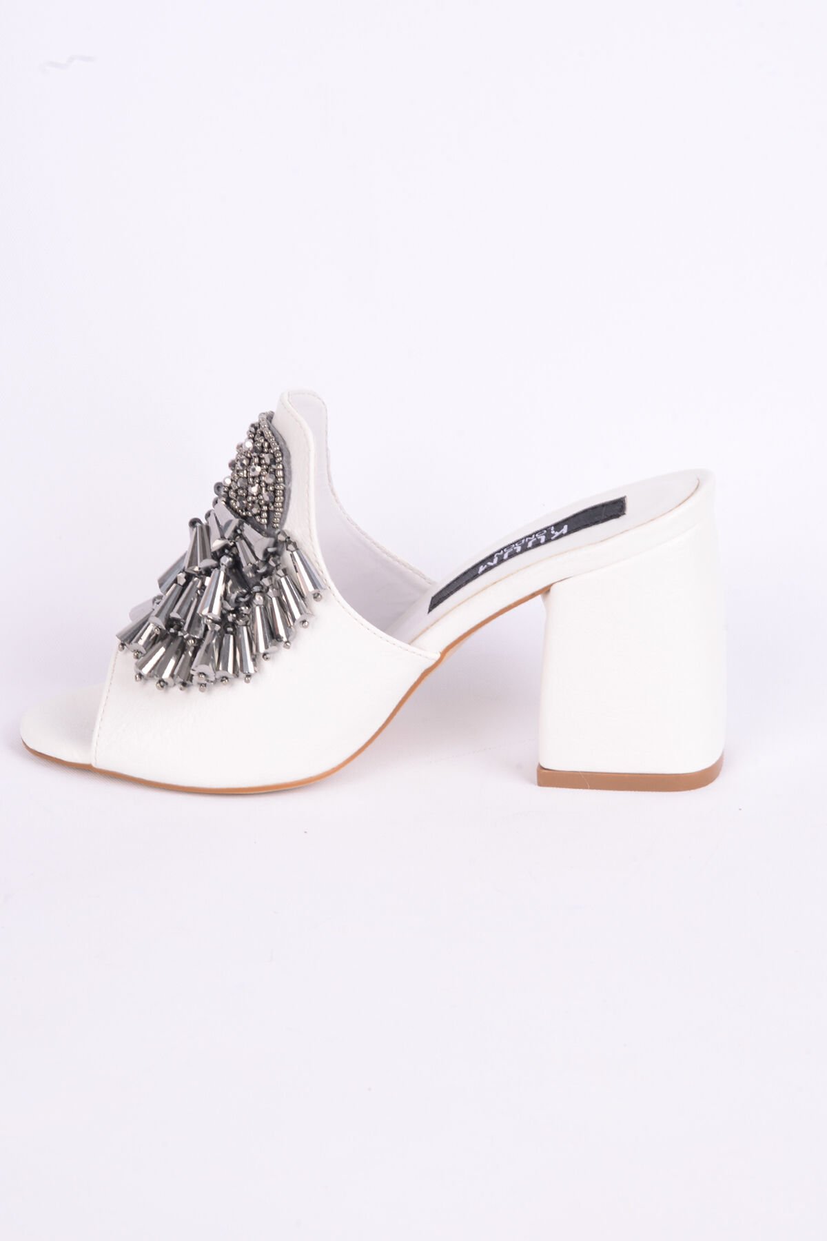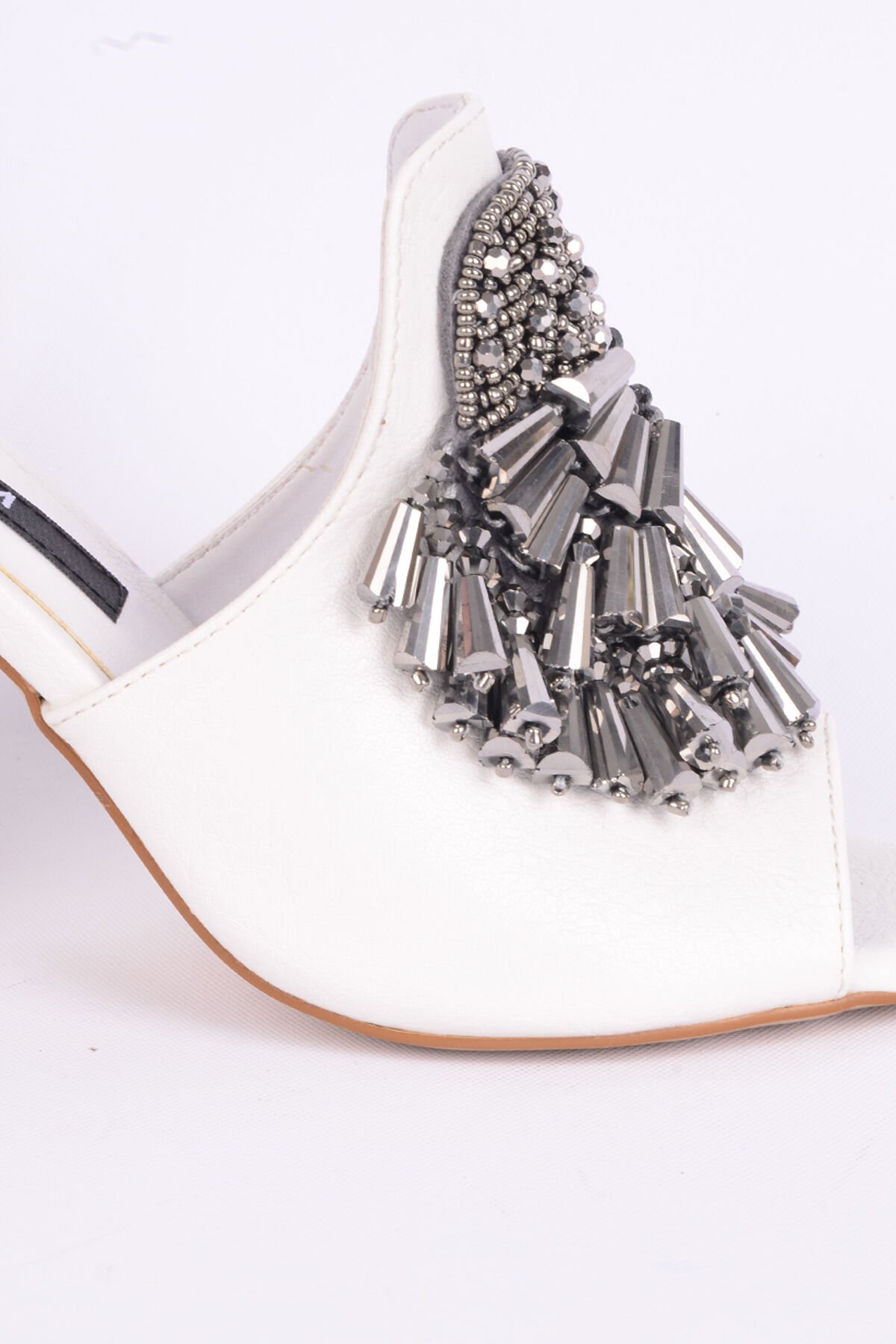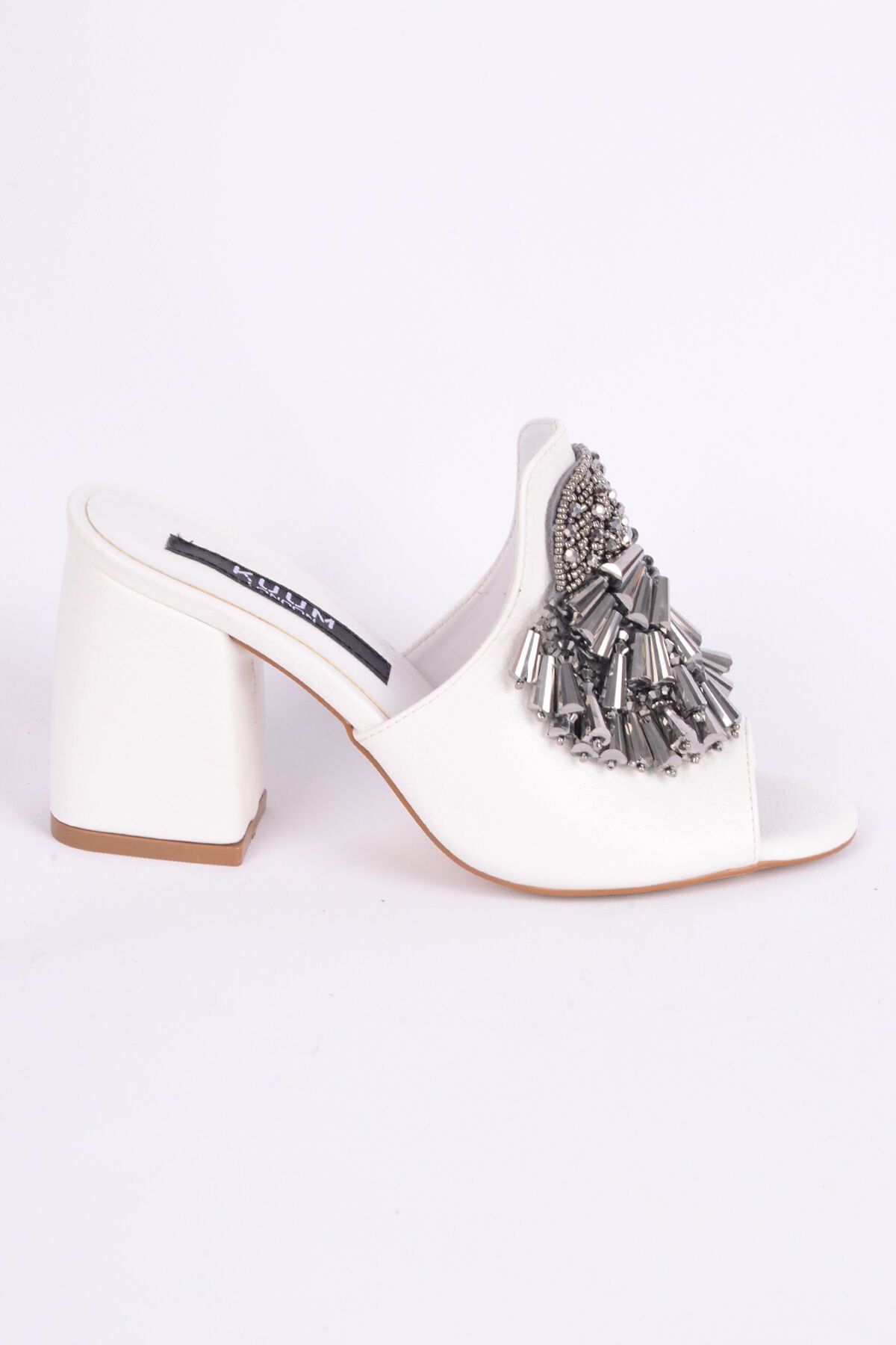 Kuum K1021249 Deri İnce Taban Yüksek Topuklu Önü Taş Aksesuarlı Beyaz Günlük Kadın Terlik