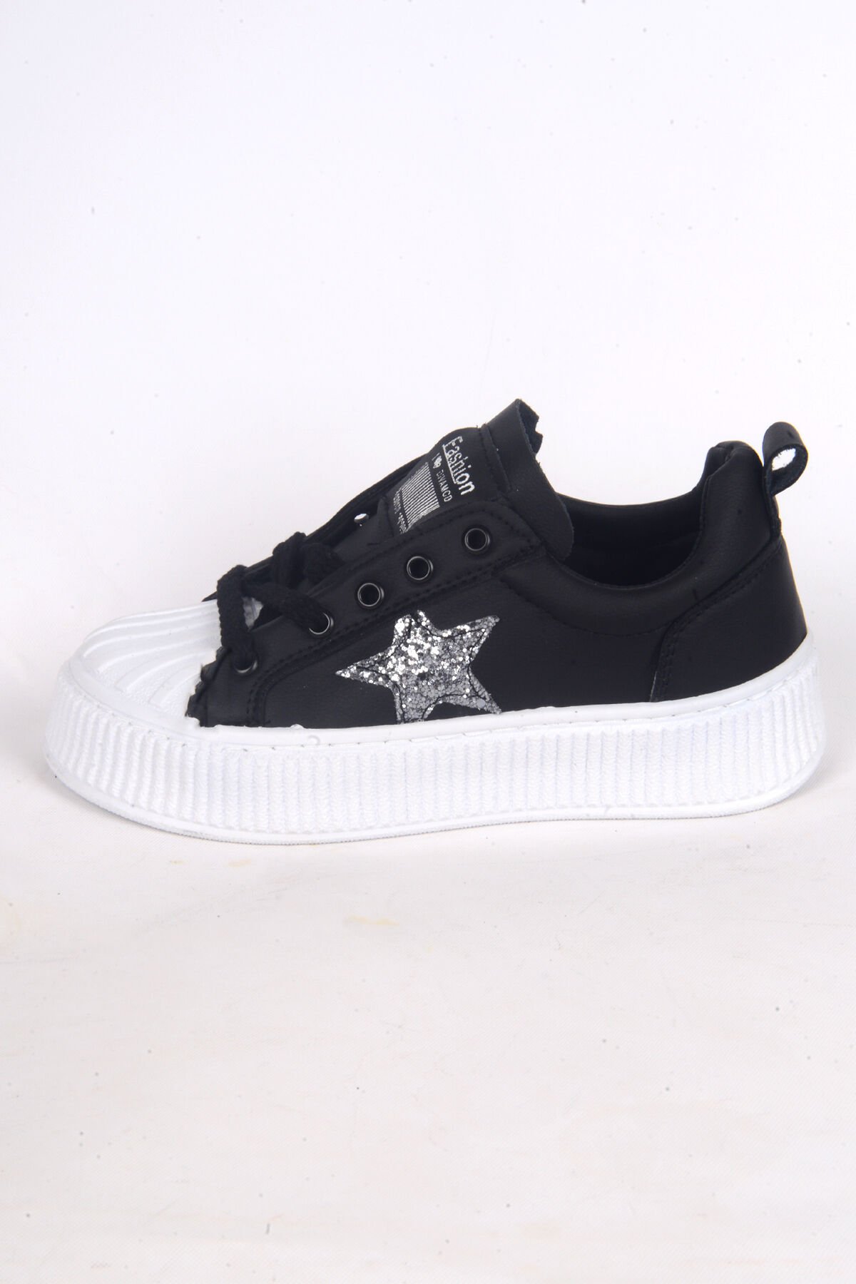 Kuum K1127100 Fashion Deri Yüksek Taban Rahat Ortepedik Bağcıklı Yandan Yıldız İşlemeli Siyah Kadın Günük Ayakkabı
