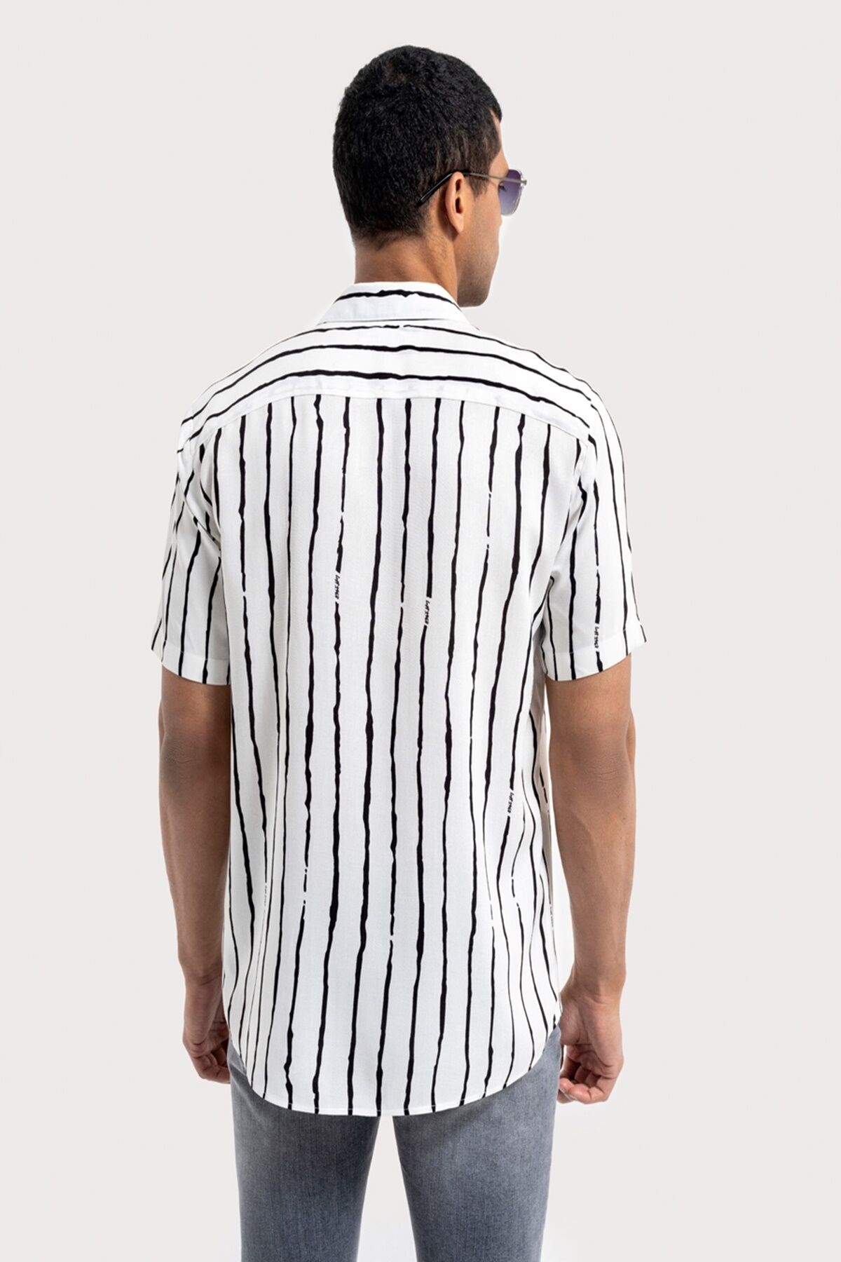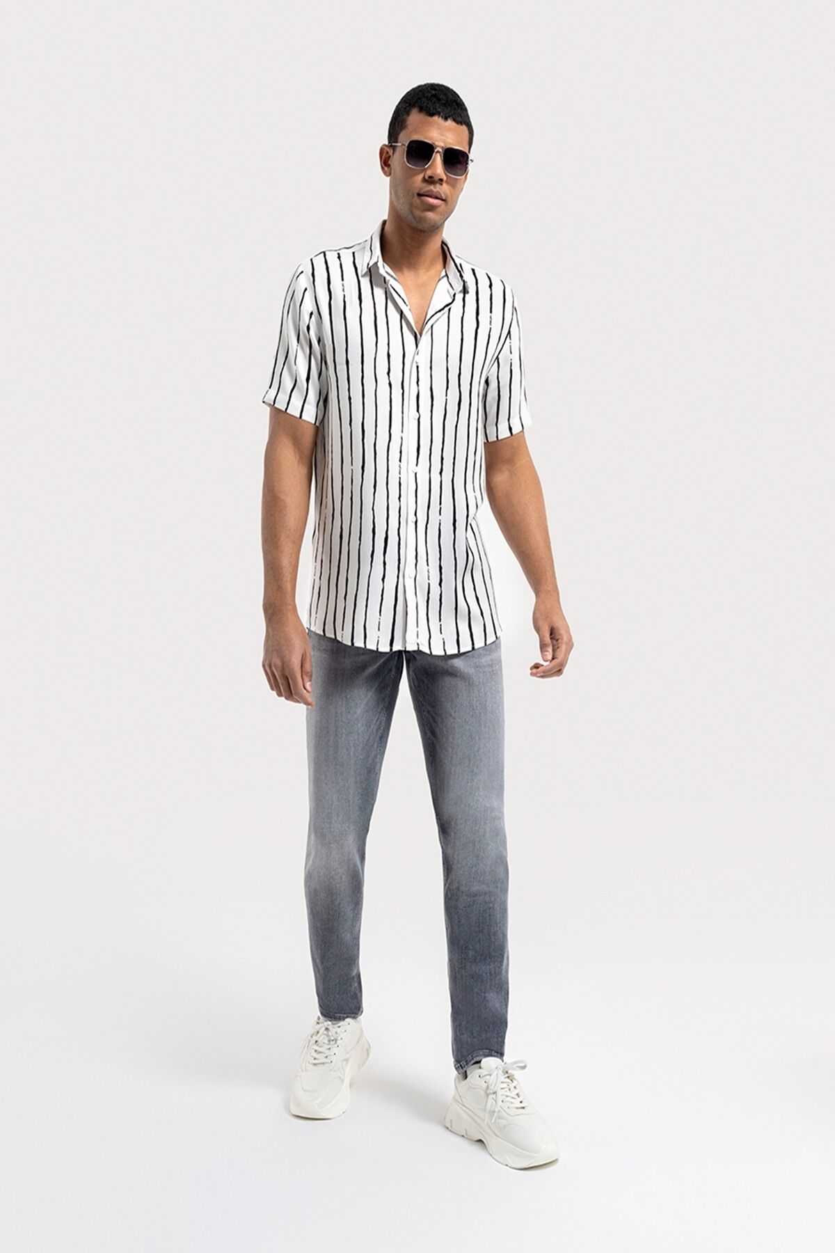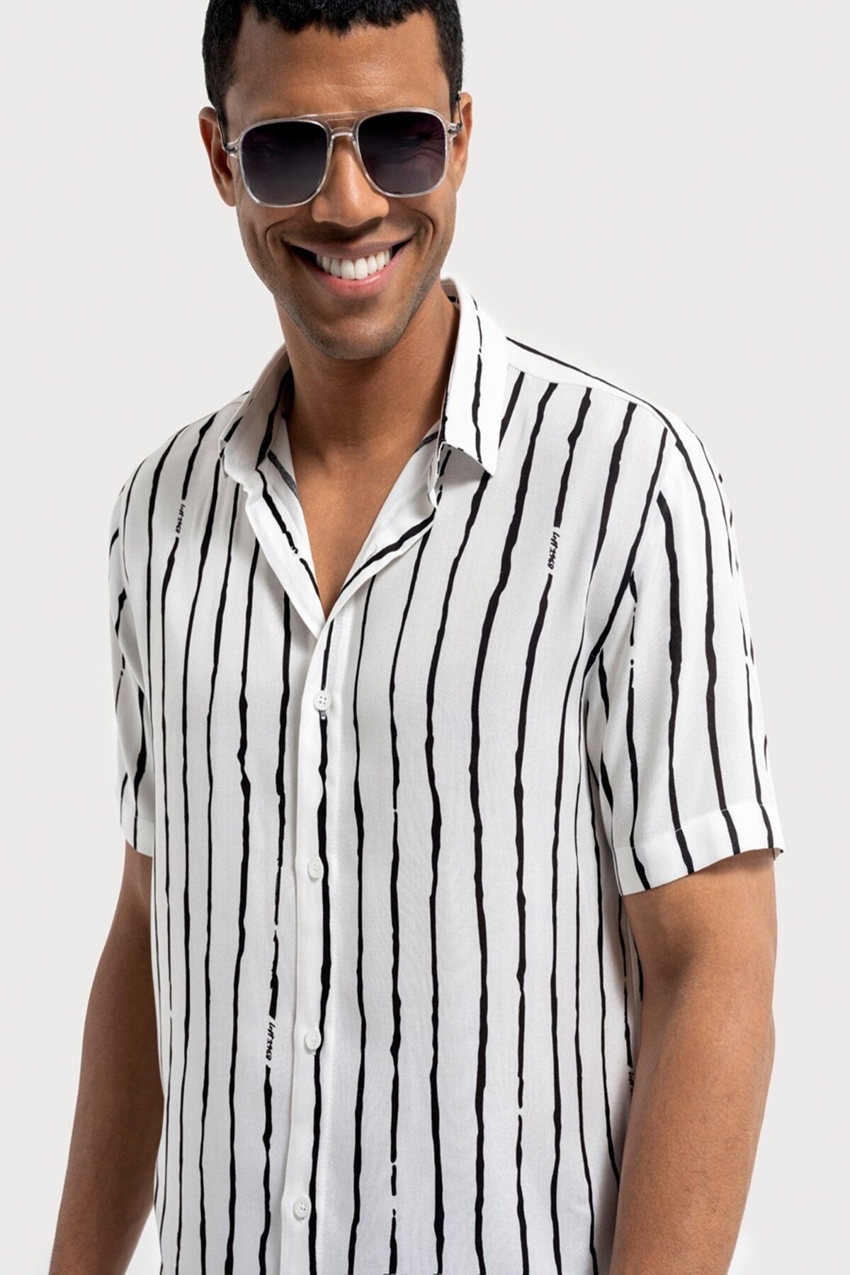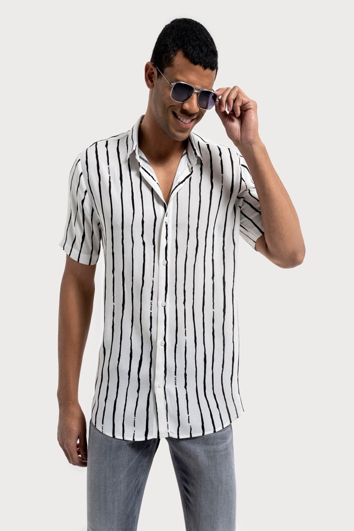 Loft 2035179 Beyaz Erkek Relax Fit Açık Yaka Önü Düğmeli Rahat Kesim Siyah Çizgili %100 Viskoz Kısa Kol Gömlek