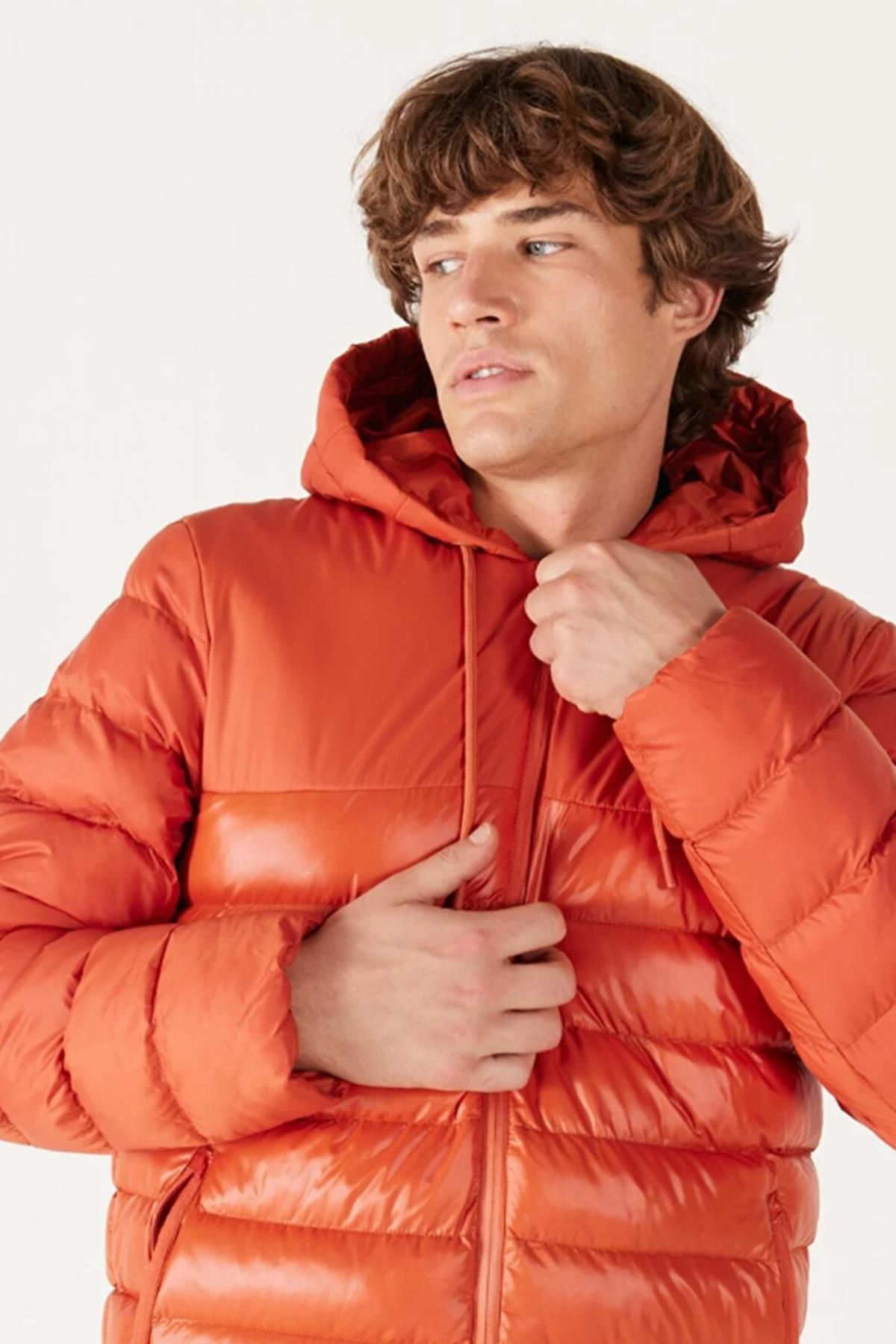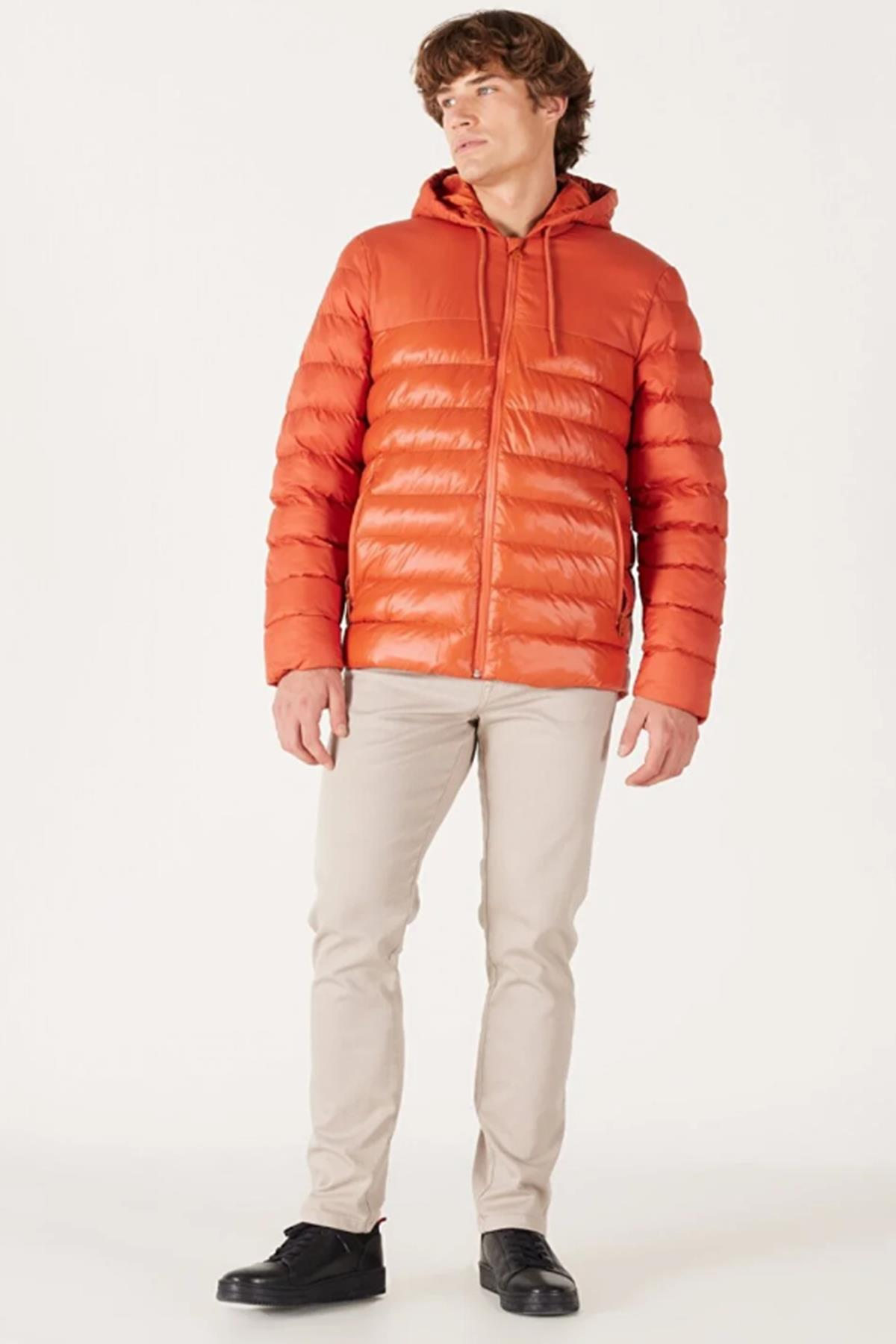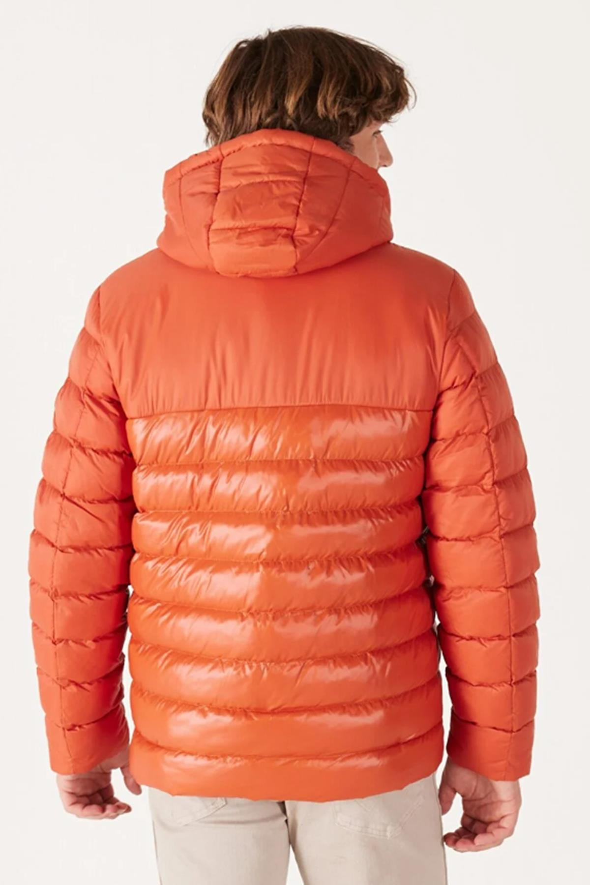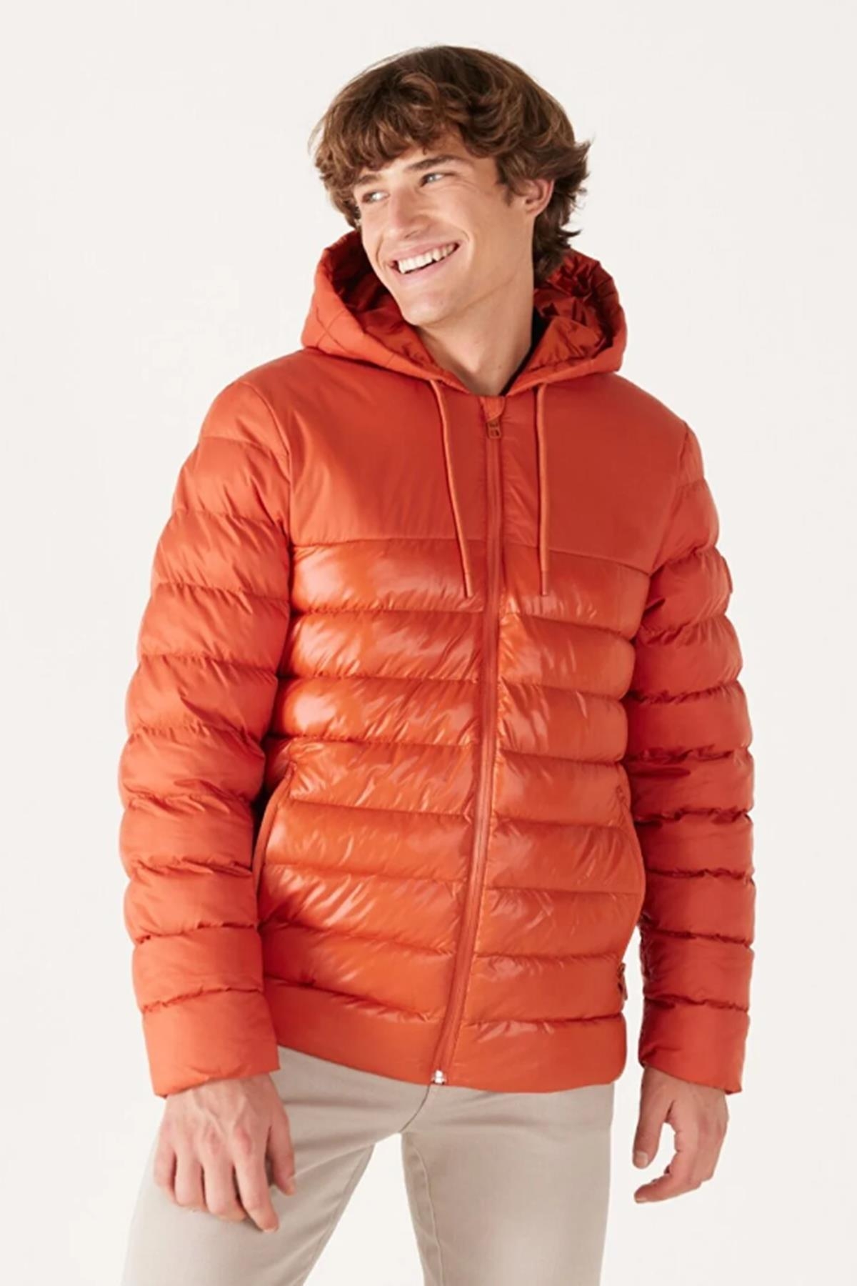 Regular Fit Normal Kesim Kapüşonlu Turuncu Şişme Mont